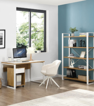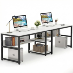 KRAYOG Doris Two-Person Desk – 240 cm, White Wood & Metal, DIY Computer Table with Bookshelf Storage, Ideal for Home or Office