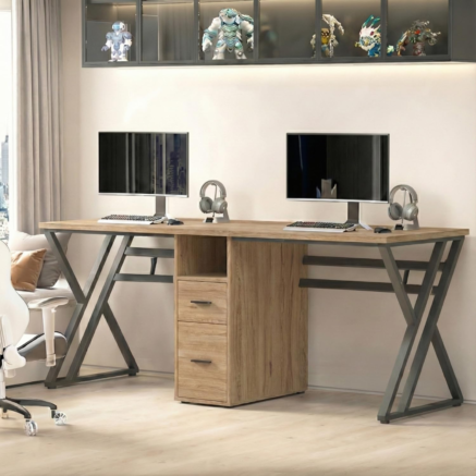 KRAYOG Two-Person Desk – 240×60×75 cm, Brown Wood, DIY Computer Workstation with 2 Drawers and 1 Shelf, Ideal for Home or Office