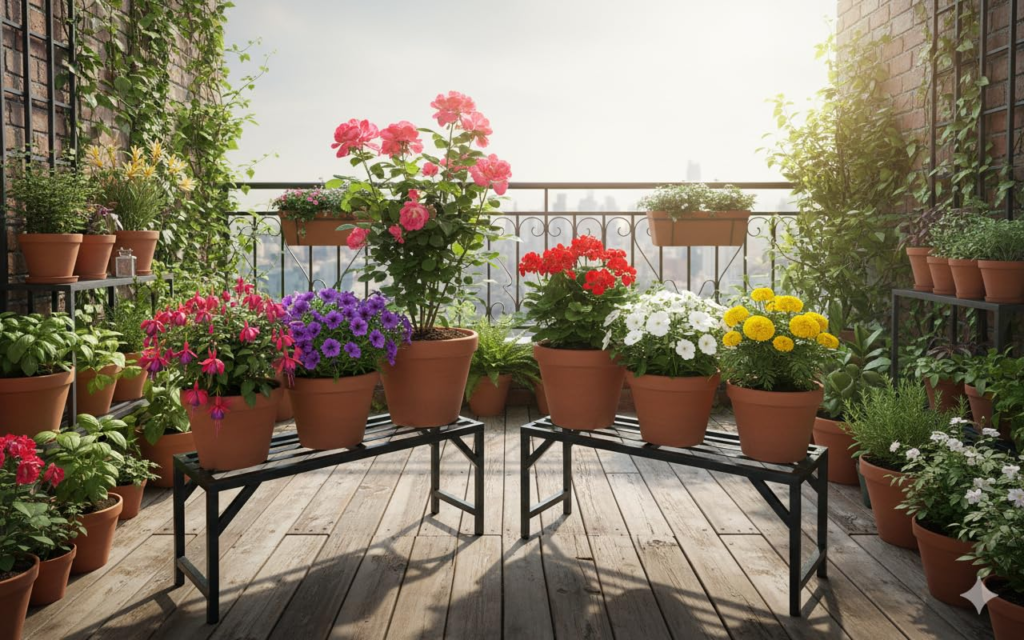 KRAYOG Single-Step Plant Stand & Pot Holder | Black Iron Garden Bench for Roof, Balcony, and Outdoor Use