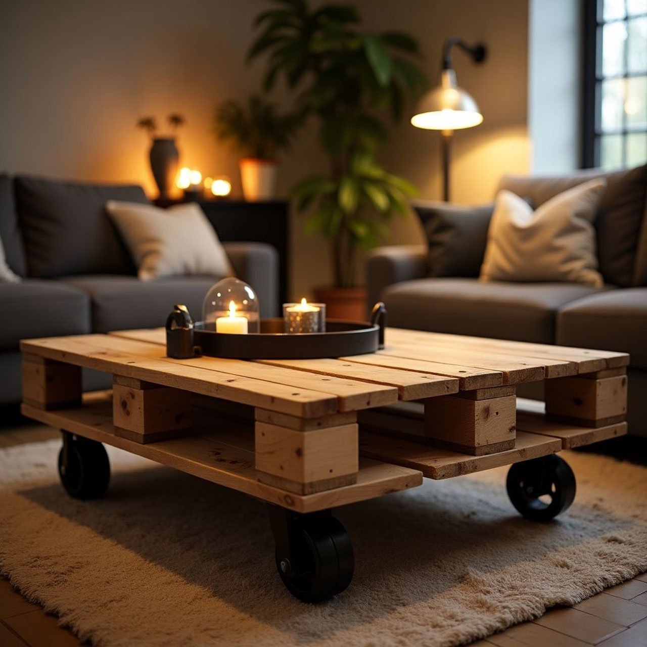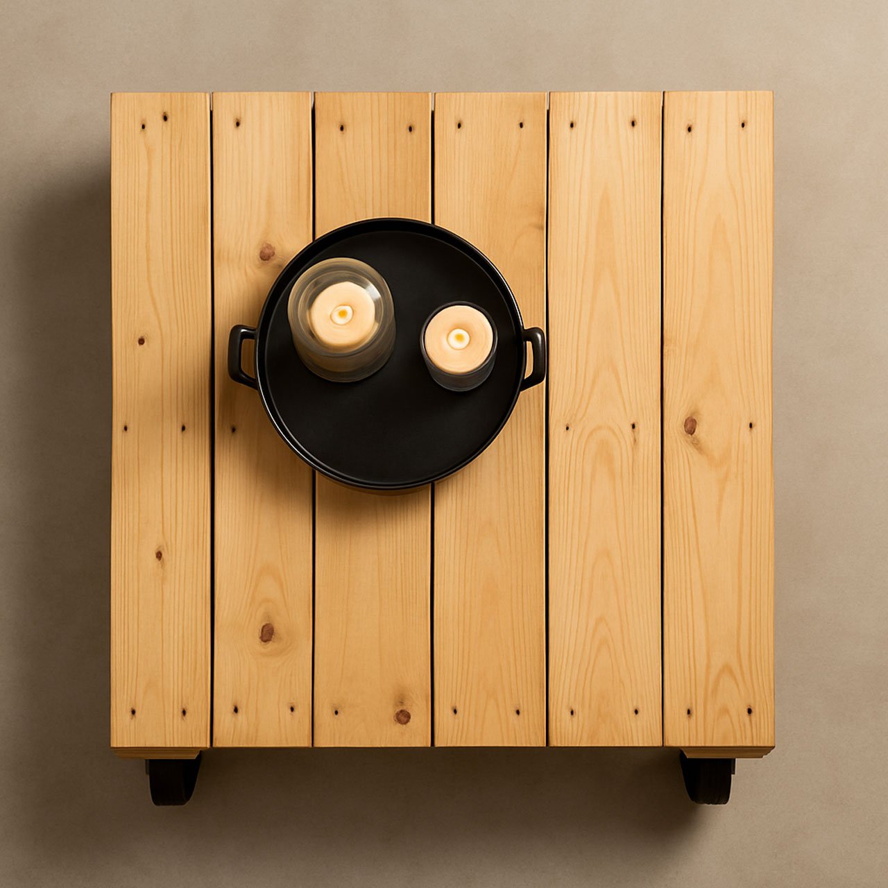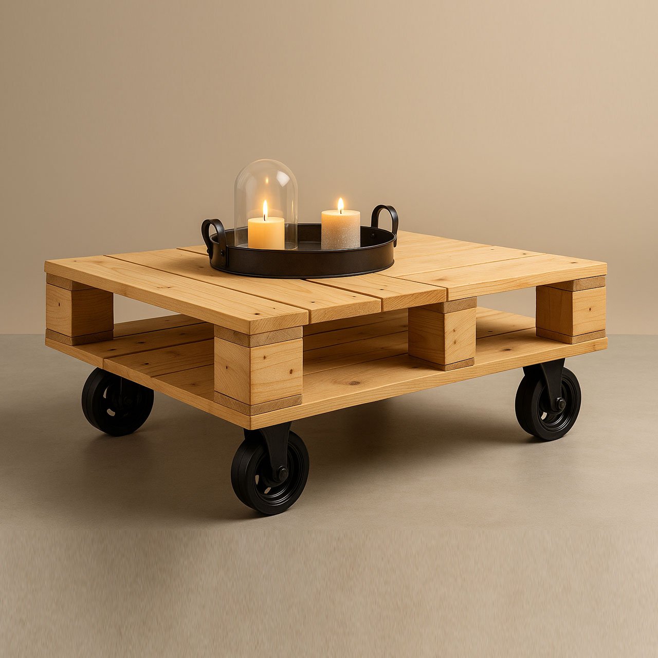 Handcrafted Wooden Coffee Table on Wheels – Pinewood 2-Tier Shelf for Living Room