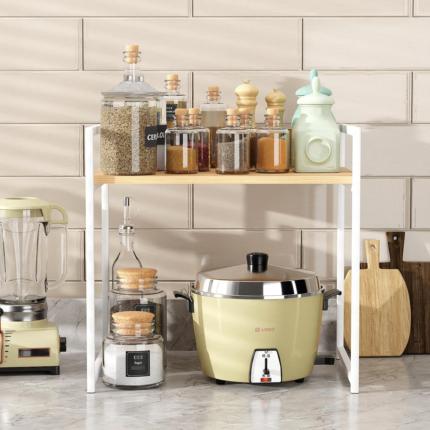KRAYOG 1 Tier Multipurpose Storage Rack – Heavy Duty Metal & Wood Kitchen Organizer | Space-Saving Microwave Oven Stand for Modular Kitchen, Living Room, Bedroom & Office (MKR-001, White & Light Oak)