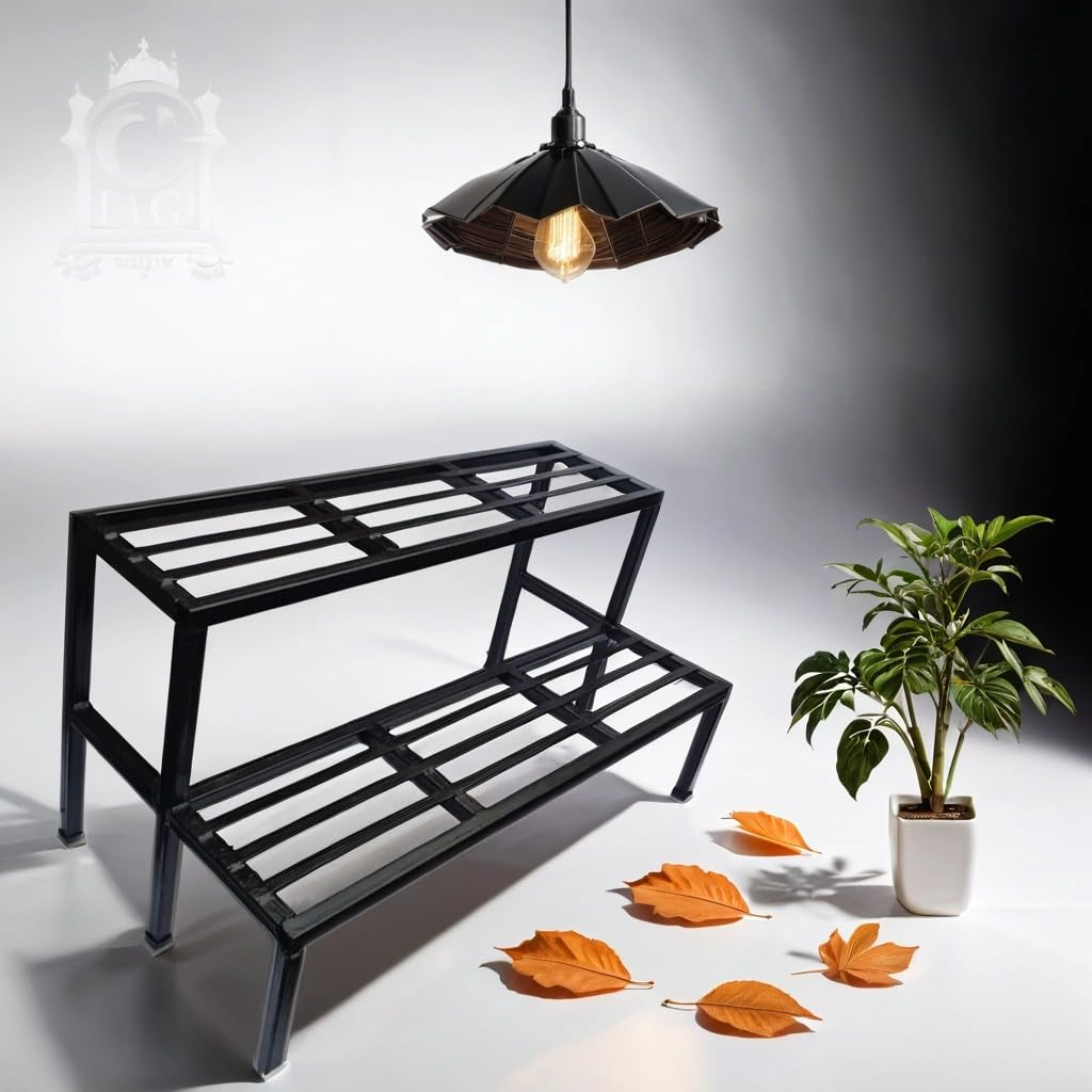 Durable 2-step black garden plant stand, designed to securely hold flower pots. Perfect for indoor or outdoor use, combining heavy-duty strength with stylish design.