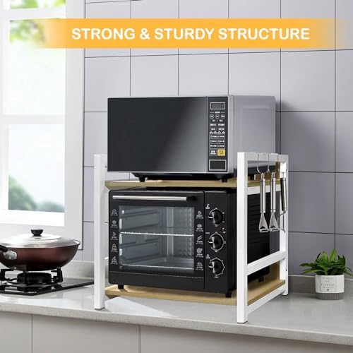 KRAYOG 2-Tier Multipurpose Storage Rack – Heavy Duty Metal & Wood Kitchen Organizer | Space-Saving Microwave Oven Stand for Kitchen, Living Room, Bedroom & Office (MKR-002, White & Light Oak)**