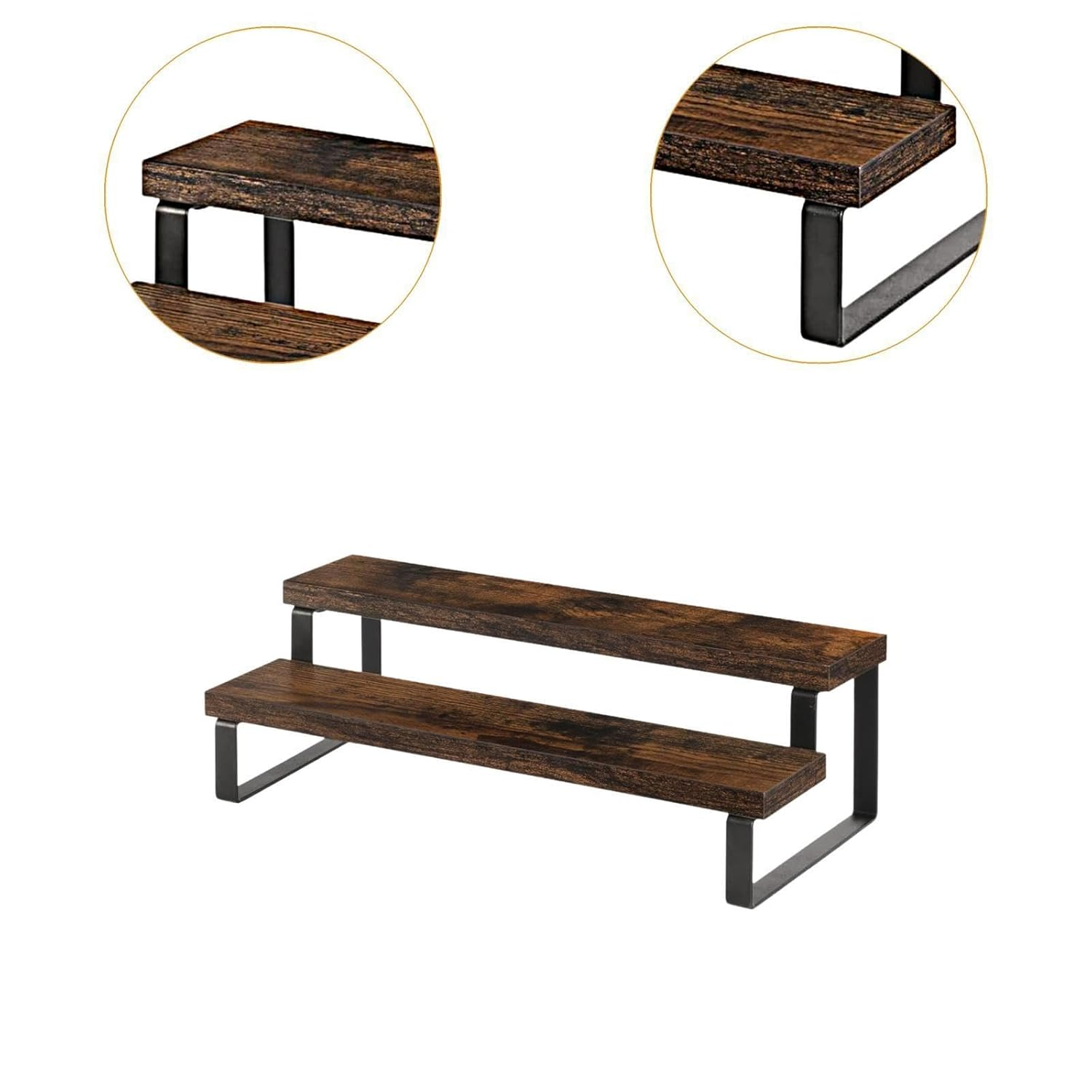 Organize and showcase your essentials with this 2-tier wooden display riser stand. Designed in a rich brown finish, it works perfectly as a kitchen spice rack or a countertop organizer for perfume, makeup, and condiments. Sturdy, space-saving, and ideal for adding a neat, stylish touch to any space.