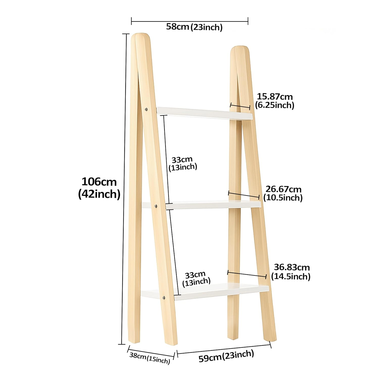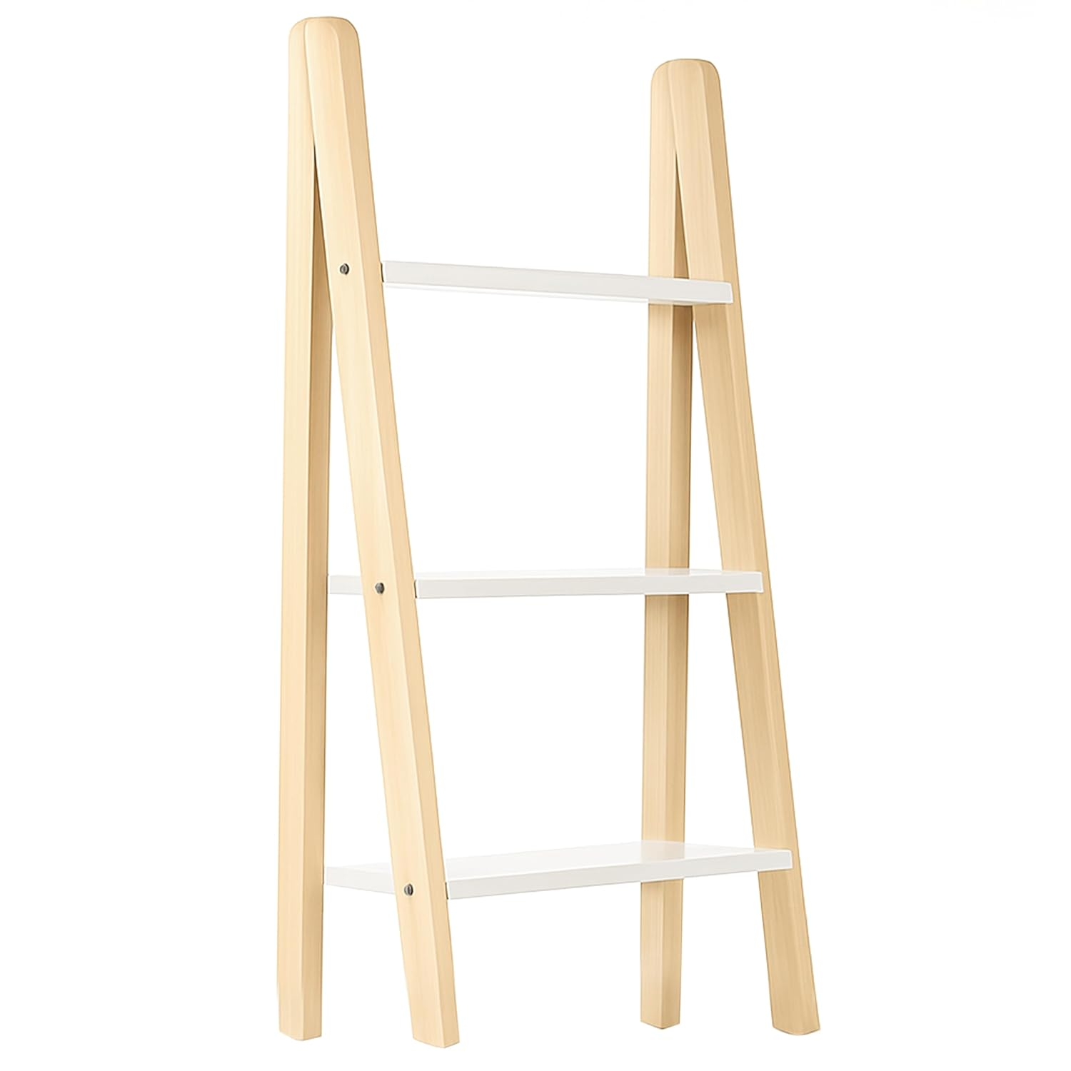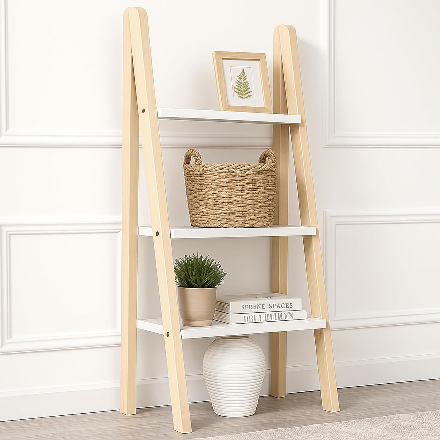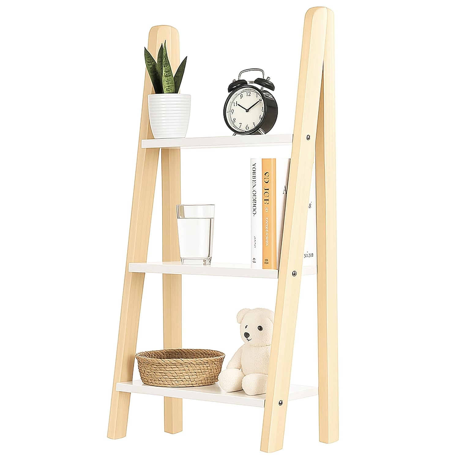 - ✨ White Glossy Shelves – Modern Aesthetic Features Three open shelves made from high-gloss particle board, offering a stylish contrast to the natural wood frame—perfect for modern and minimal interiors.