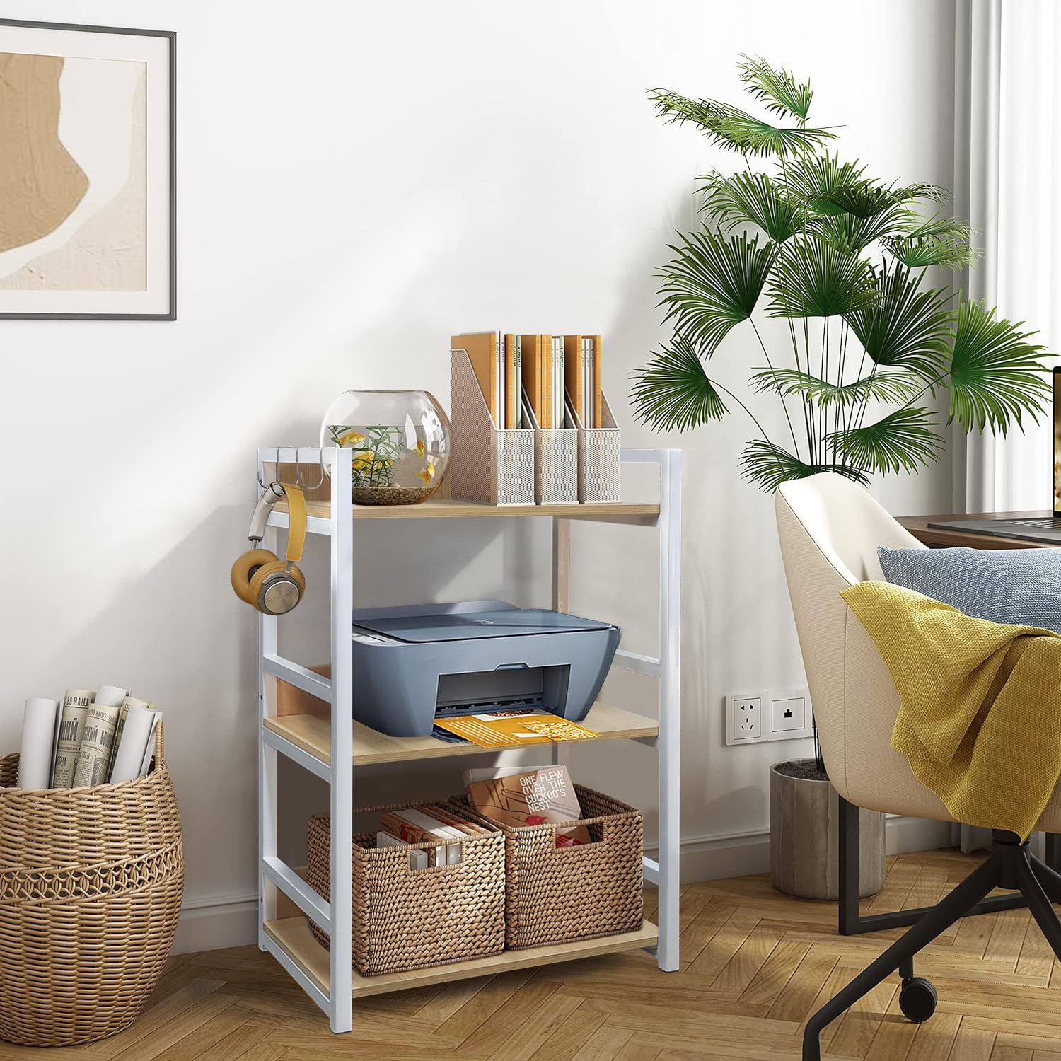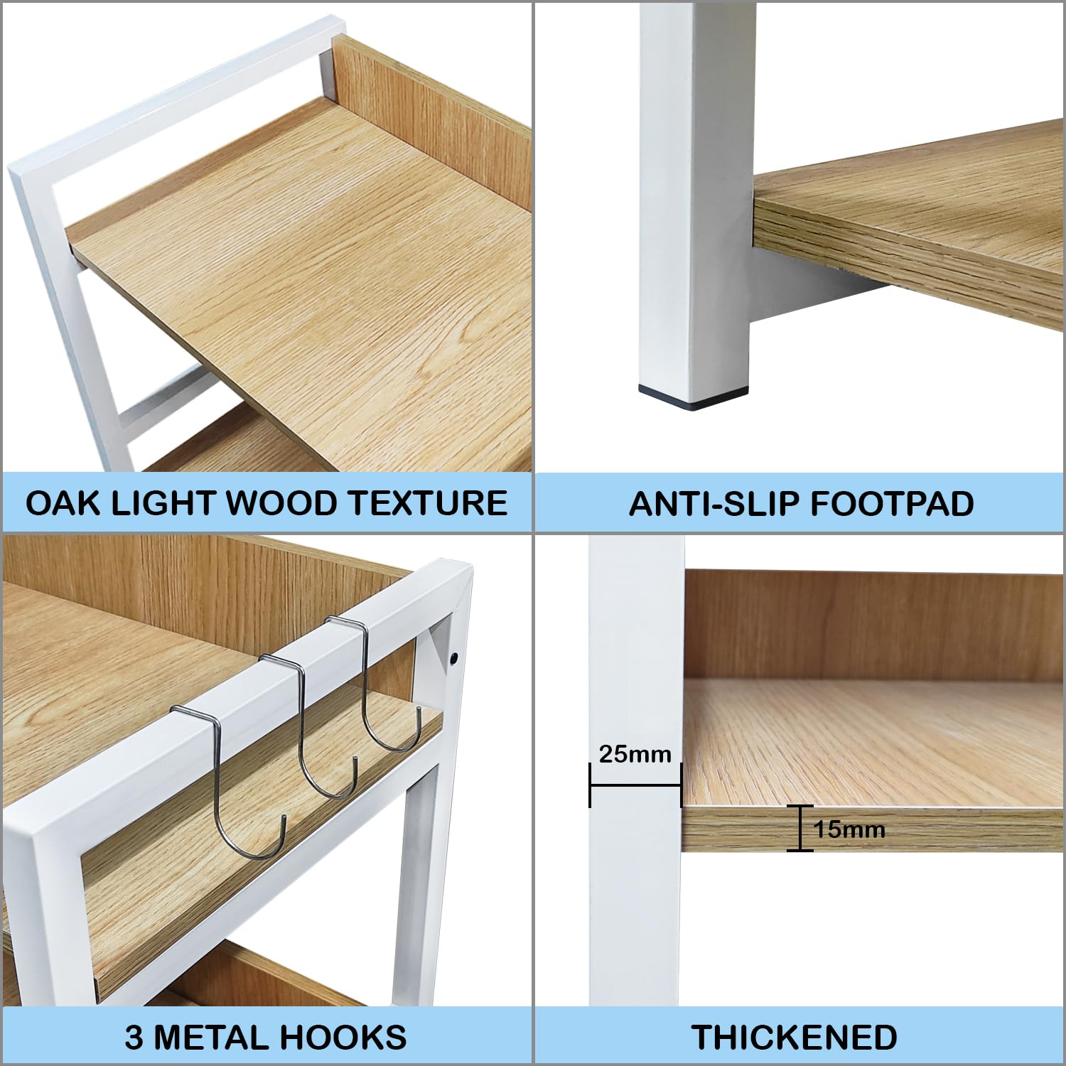 The 3 Tier Multipurpose Storage Rack (MKR-003) in White & Light Oak is designed with a strong metal frame and durable engineered wood shelves for dependable support. Its vertical, space-saving design makes it perfect for microwaves, kitchen essentials, décor, or office storage, adding both functionality and modern style to any space.