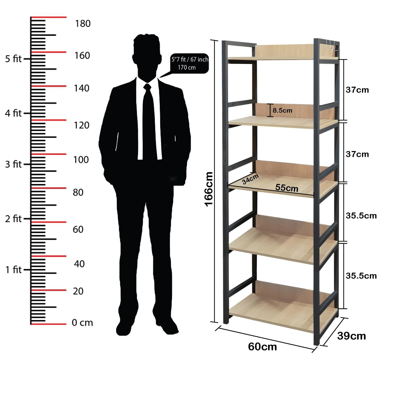 Krayog 5 Layer Multipurpose Storage Rack – Heavy Duty Metal & Wood Kitchen Organizer | Space Saving Microwave Oven Stand for Modular Kitchen, Living Room, Bedroom & Office (MKR-005/Black & Oak Light)