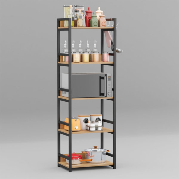 Enhance your home organization with this 5-layer multipurpose storage rack crafted from a heavy-duty metal frame and sturdy wooden shelves. Ideal as a space-saving microwave oven stand or versatile organizer for modular kitchens, living rooms, bedrooms, and offices. The elegant black and oak light finish adds a warm, contemporary look while keeping essentials neatly arranged.