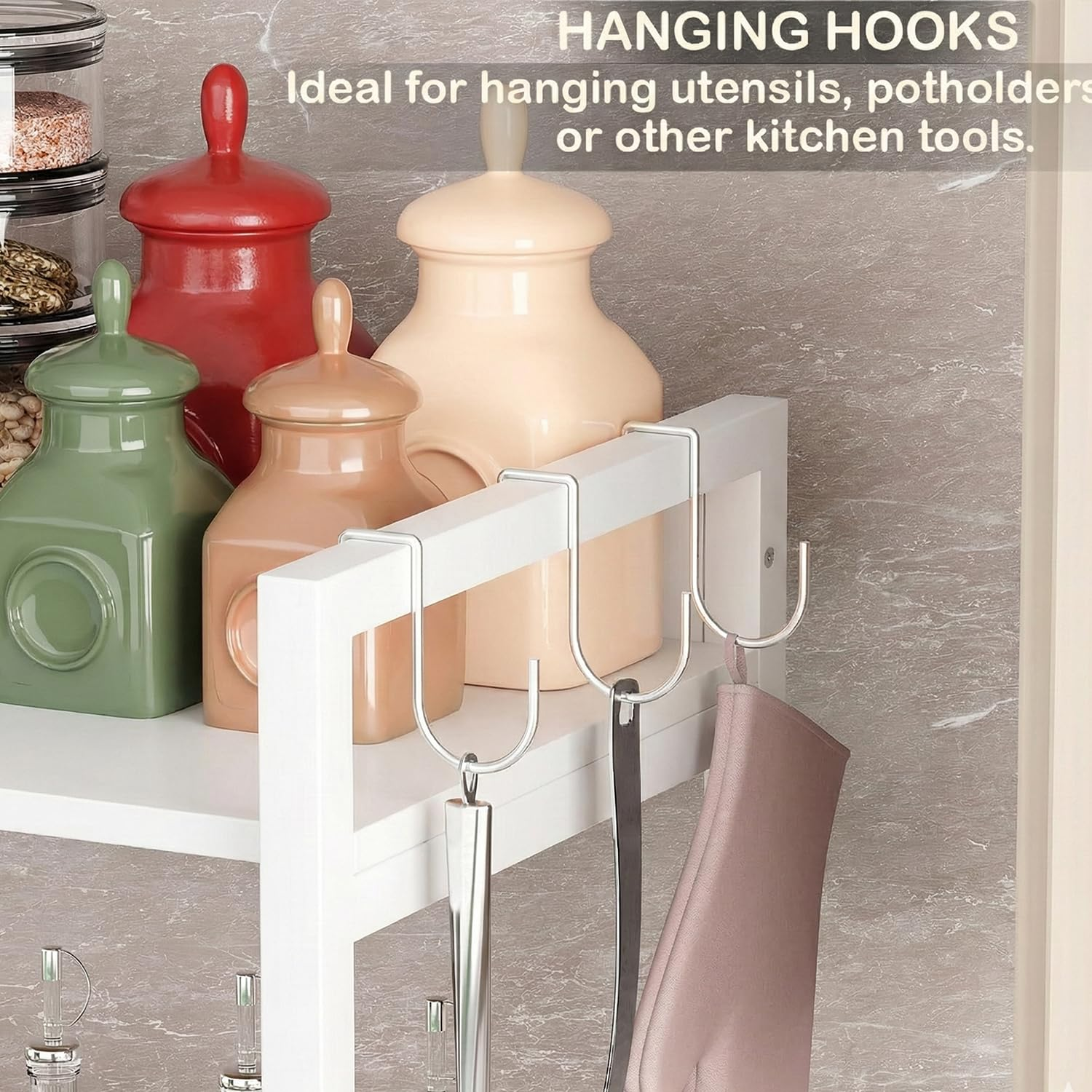 - Stylish & Practical Design: The combination of white-finished shelves and matte-coated metal gives a chic industrial look suitable for homes, offices, salons, or retail spaces, This rack is equipped with 3 versatile side hooks for mugs, keys, or towels, and adjustable anti-slip footpads that ensure perfect balance and floor protection.