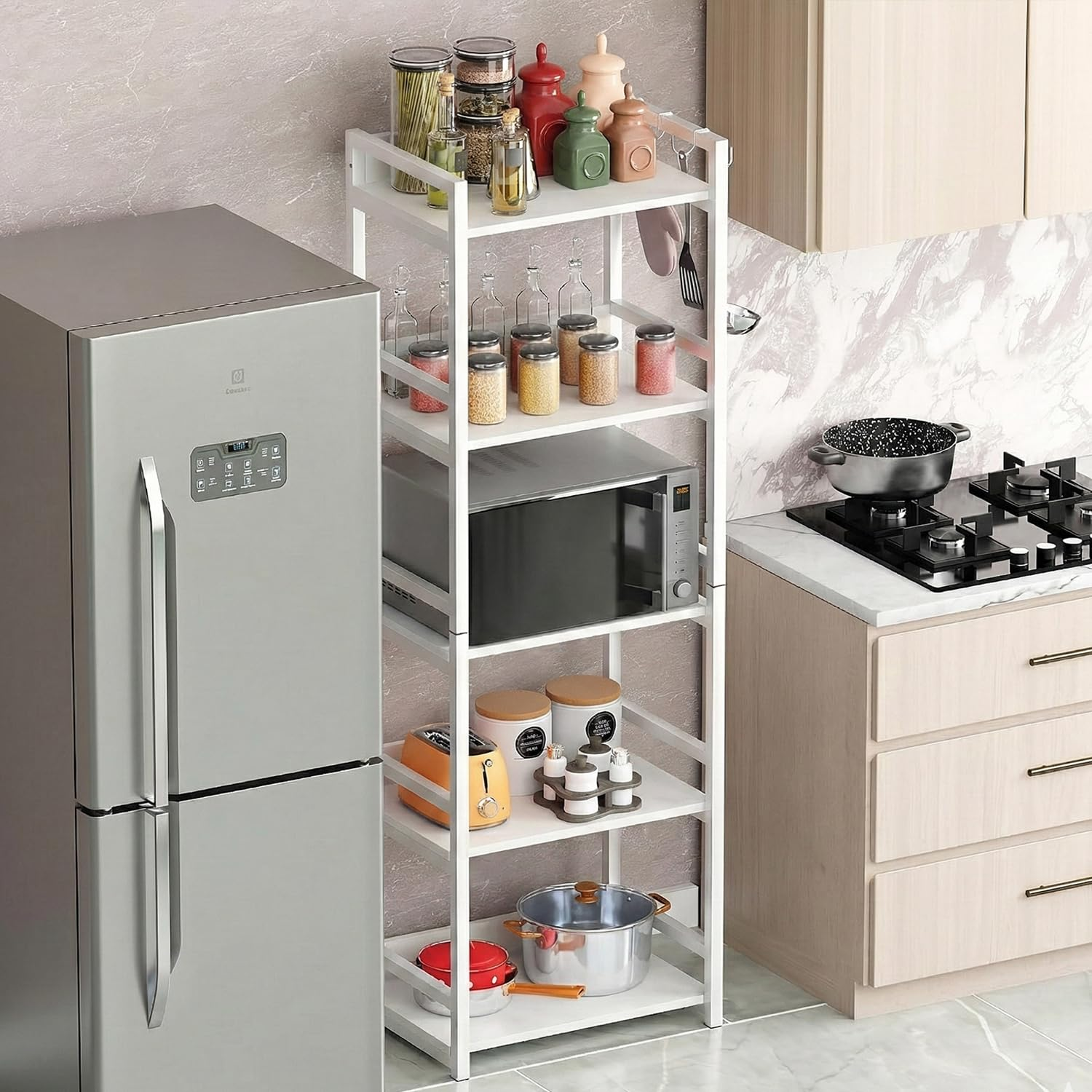 Create extra storage with this 5-layer multipurpose rack built from a heavy-duty metal frame and durable wooden shelves. Perfect as a space-saving microwave oven stand or versatile organizer for modular kitchens, living rooms, bedrooms, and offices. The sleek white finish delivers a clean, modern look while keeping your essentials neatly arranged.