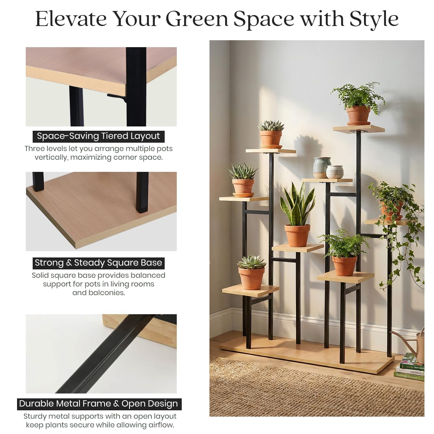 • SPACE-SAVING DESIGN: This tiered structure lets you arrange several pots vertically, making corner areas useful while keeping floors clear. It helps organize plant displays in rooms, balconies, or garden spaces neatly.