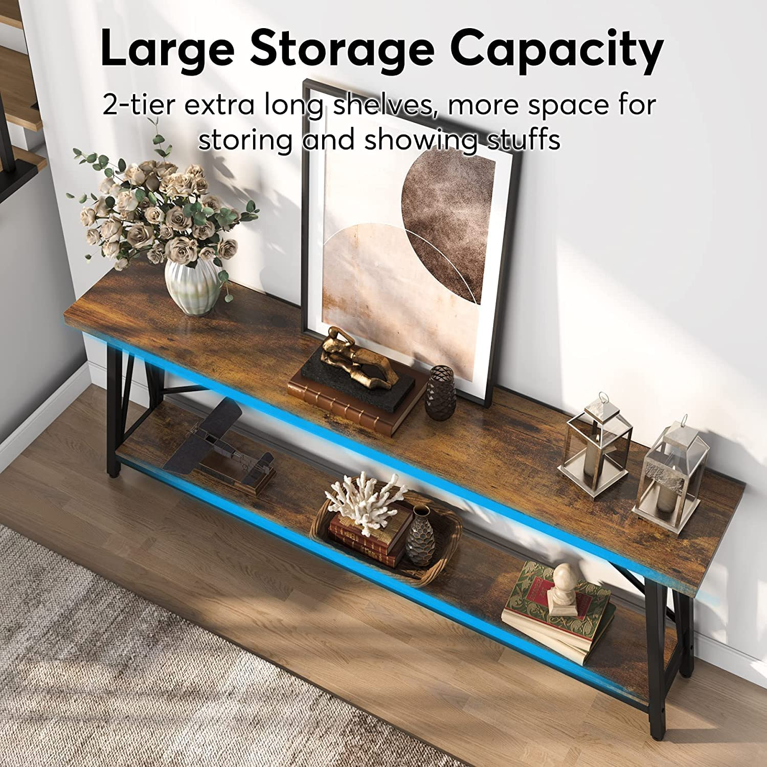 - STORAGE SPACE:180 x 30 cm wide entry way side table with 2 tier open shelves.