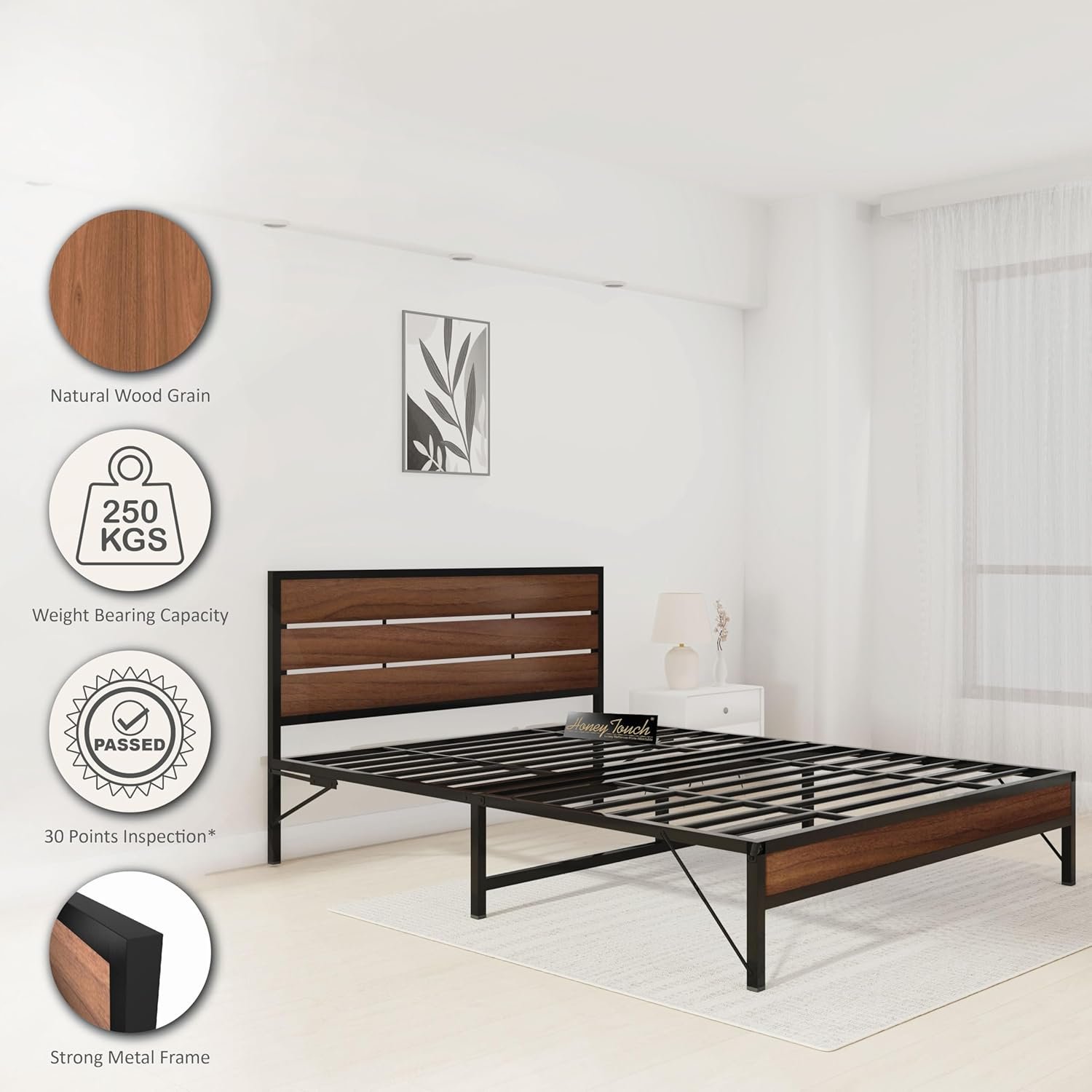 Krayog Elvo Queen Size Bed Frame | Sturdy Steel Structure with Wooden Headboard | Noise-Free | No Assembly Required | Modern Minimalist Design