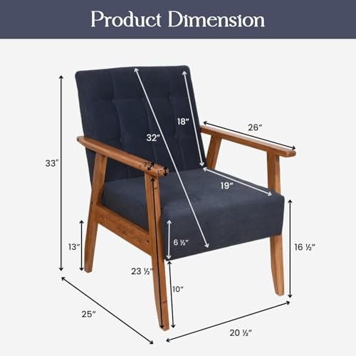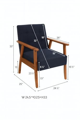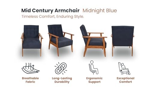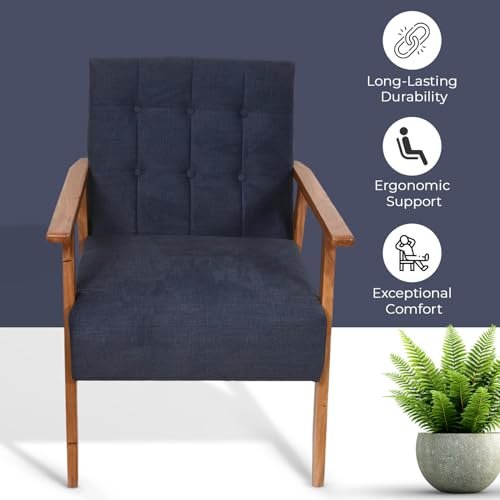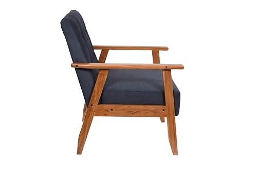Add style and comfort with the KRAYOG Mid-Century Armchair. Handmade with a solid wood frame and high-density cushion, this midnight blue chair enhances living rooms, bedrooms, and study spaces with elegance and durability.
