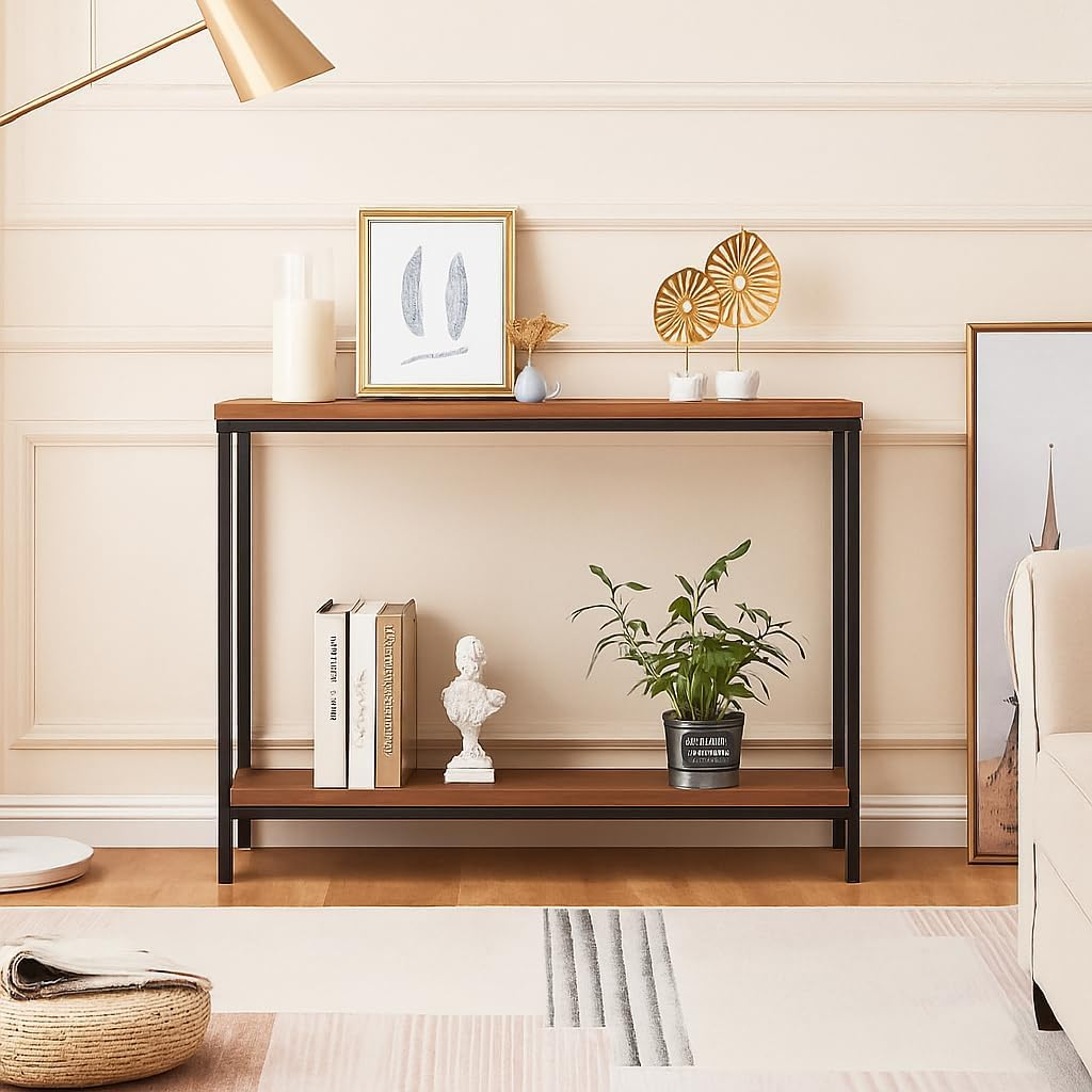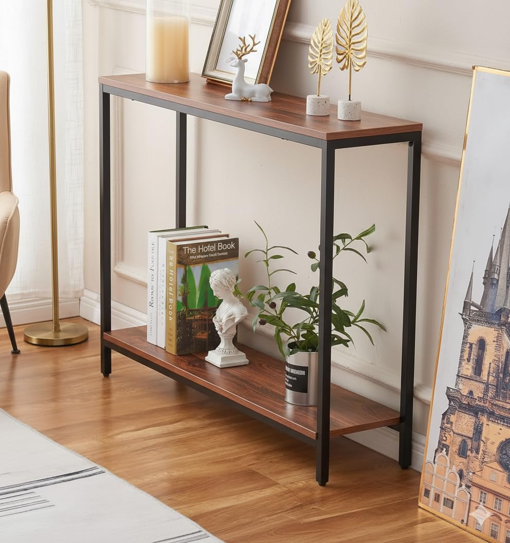 KRAYOG **Iron Frame Console Table with Storage – Premium 2-Tier Entryway & Sofa Table, Slim Accent Display for Living Room & Hallway (Black Walnut Finish)**