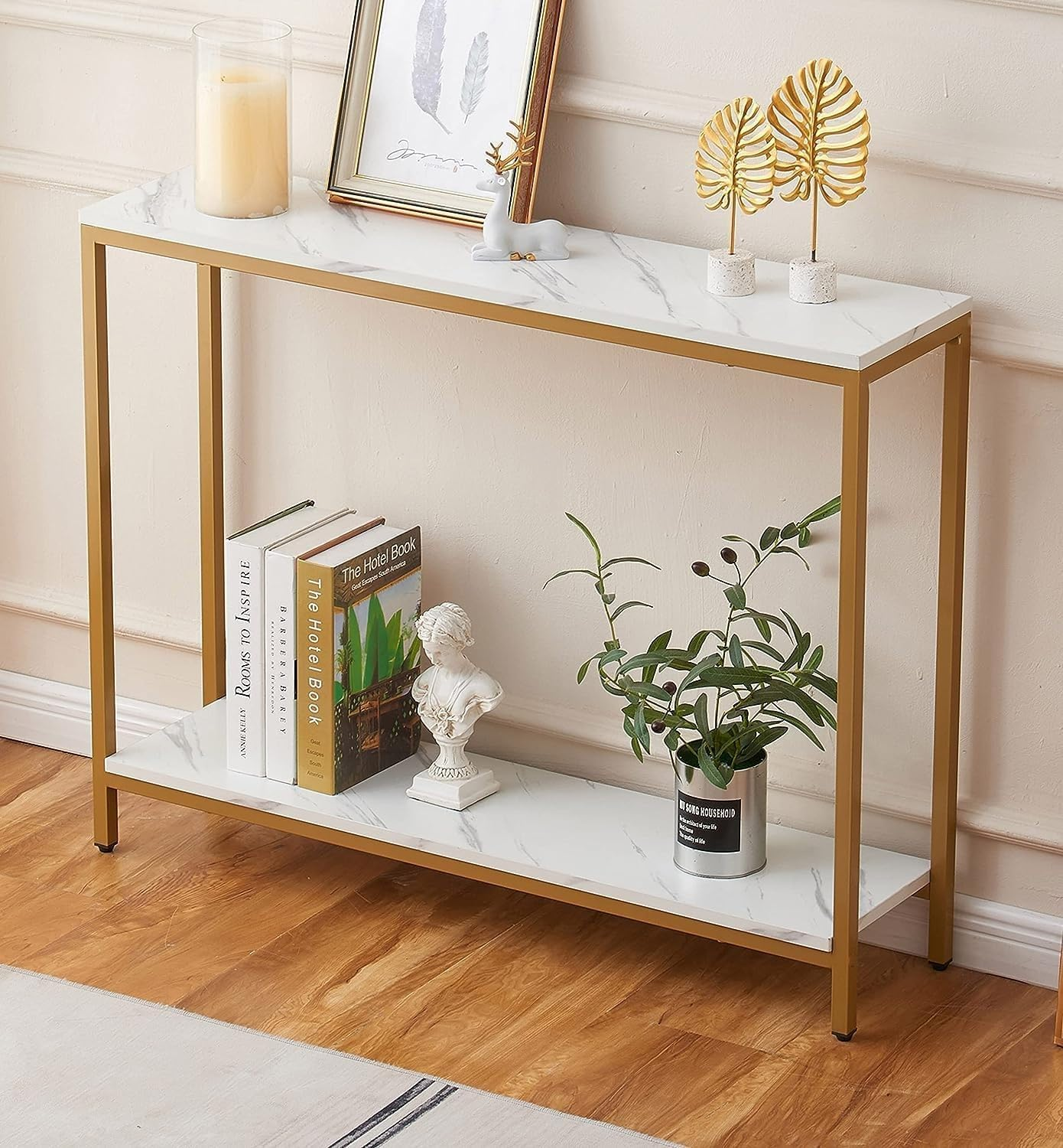 KRAYOG **Iron Frame Entryway Console Table with Storage – Premium 2-Tier Sofa Table, Slim End & Accent Display for Entryway, Living Room & Hallway (Golden & White Finish)**