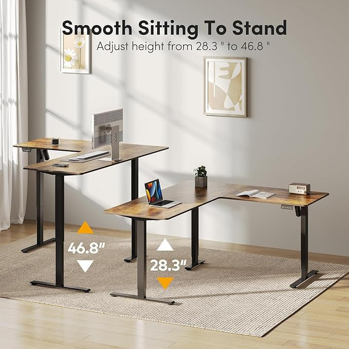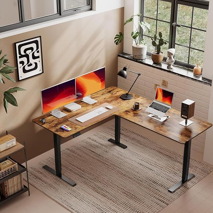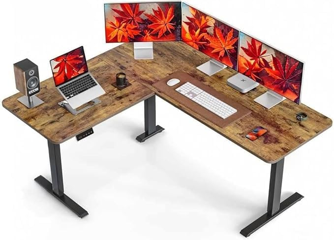 Ergonomic L-shaped electric standing desk with single-motor height adjustment. Perfect for home or office, it offers a spacious workspace, smooth sit-stand transitions, and easy DIY assembly. Available in black & brown.