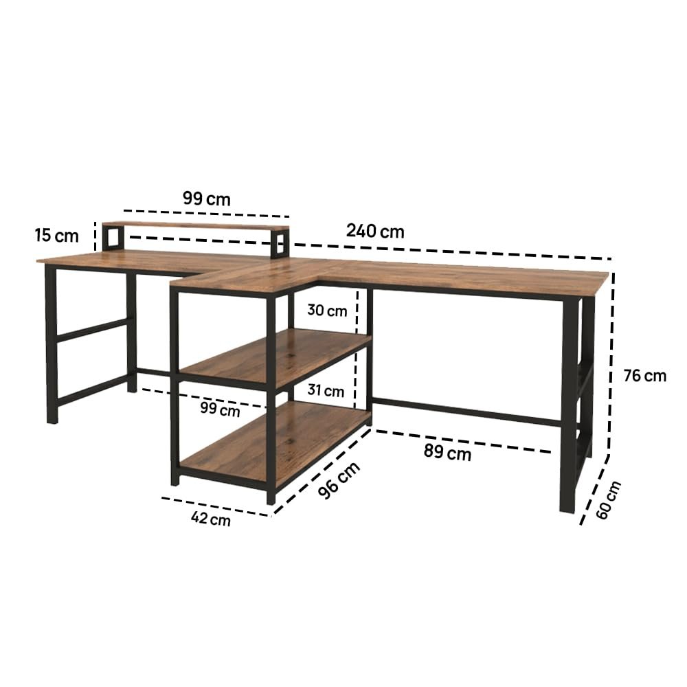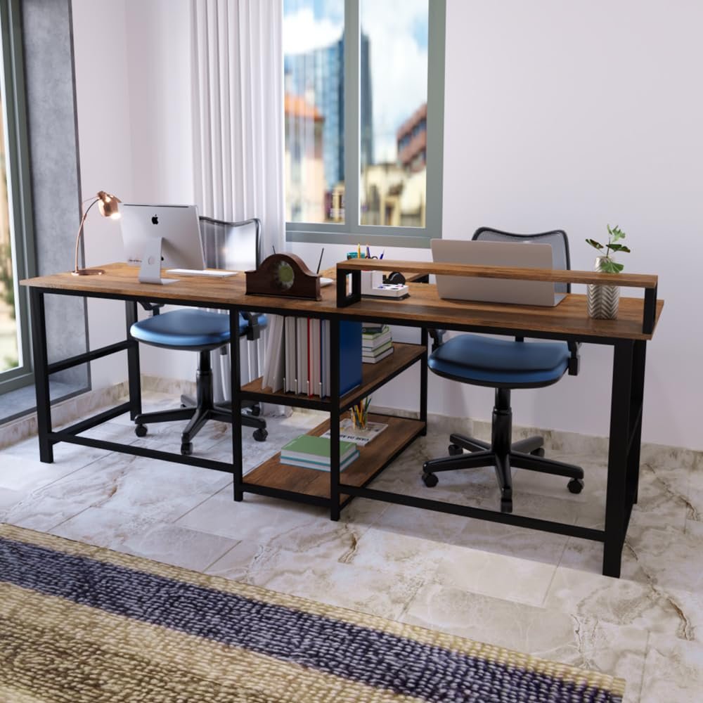- This Double person computer desk features two storage shelves to storage or decorate your desk, reduce tabletop clutter and add enough space for under-desk storage and organization.