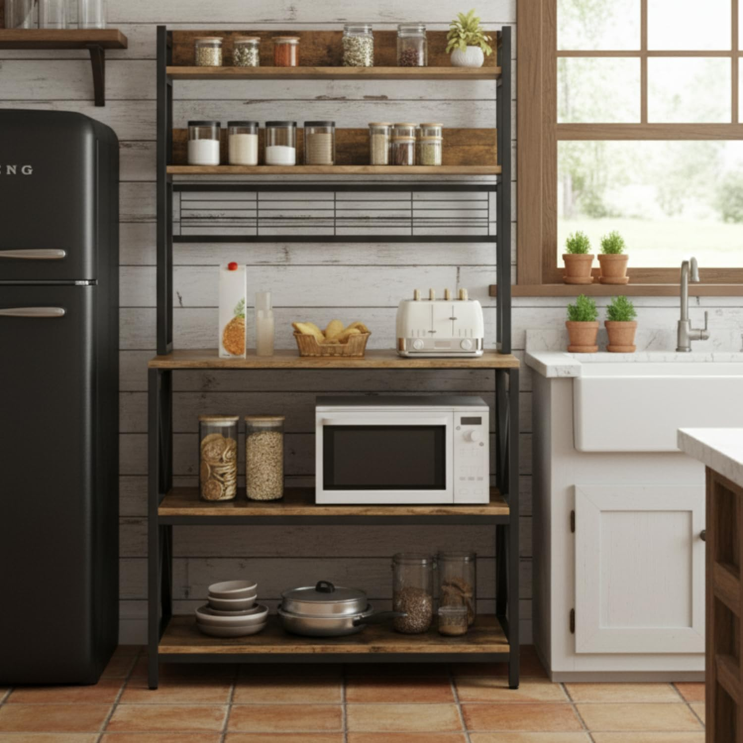 The Lita 5-Tier Heavy Duty Microwave Oven Stand is a smart and space-saving kitchen organizer. Featuring a durable multi-layer design in a modern black and rustic brown finish, it provides generous storage for your microwave, cookware, and essentials. With dimensions of 60 x 40 x 170 cm and easy DIY assembly, this rack combines strength, stability, and contemporary style for everyday kitchen use.