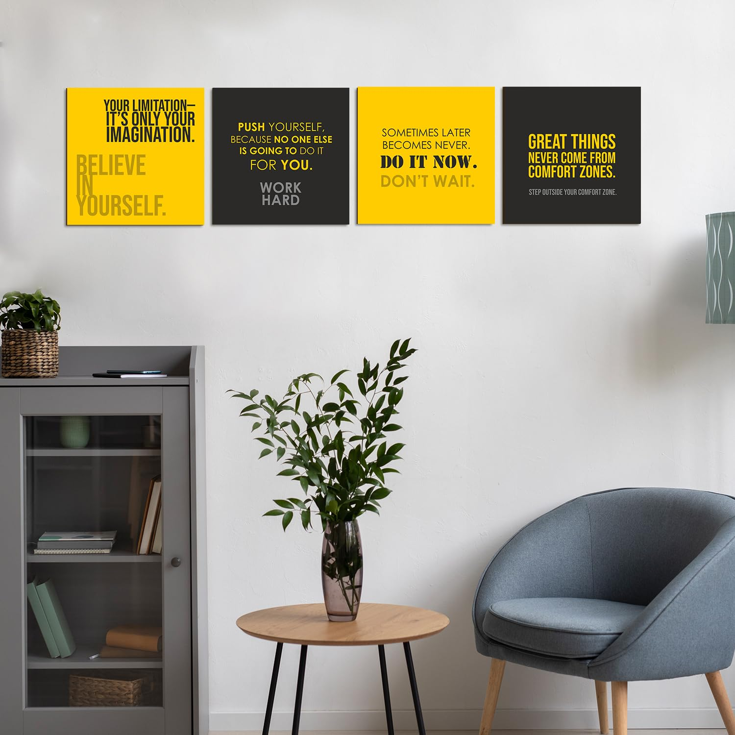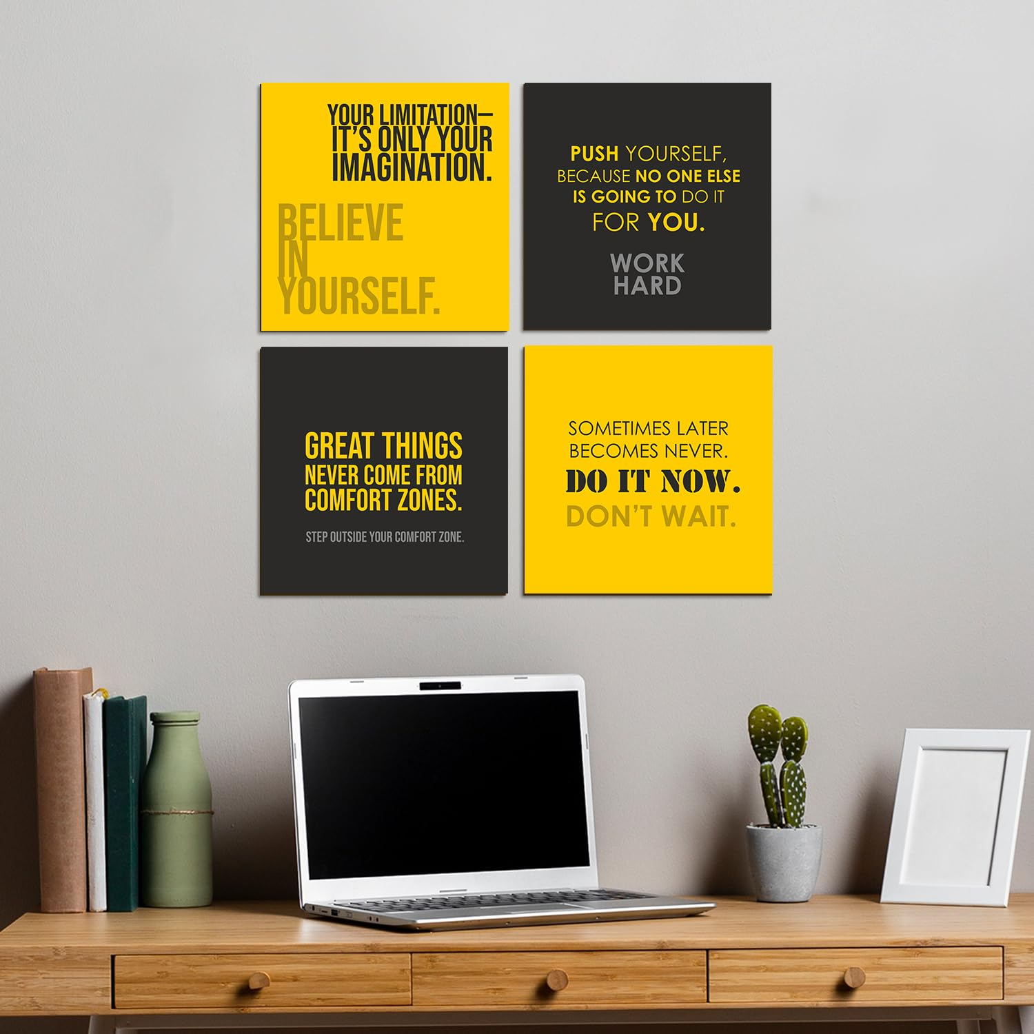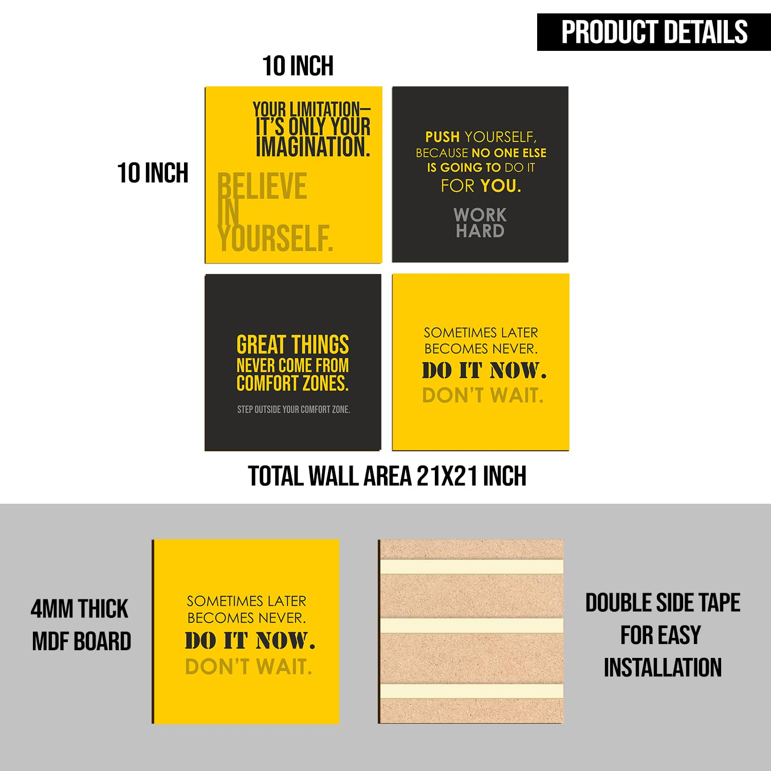 Upgrade your space with this 4-piece motivational wall art set featuring powerful quotes, premium MDF boards, and hassle-free wall mounting.