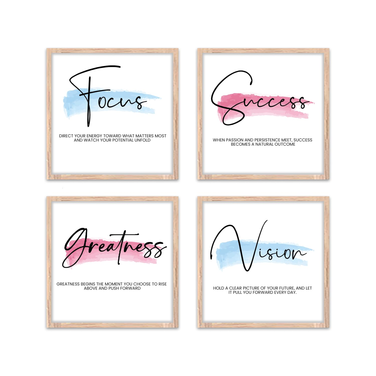 Enhance your space with this set of 4 motivational wall frames featuring inspiring quotes – Focus, Success, Greatness, and Vision. Each 10×10 inch high-quality print (300 DPI) comes in a stylish wooden frame, delivering sharp, vibrant, and pixel-free artwork. Perfect for home, office, study room, or living area décor, these multicolor canvas frames add positivity, elegance, and a modern touch to any wall.