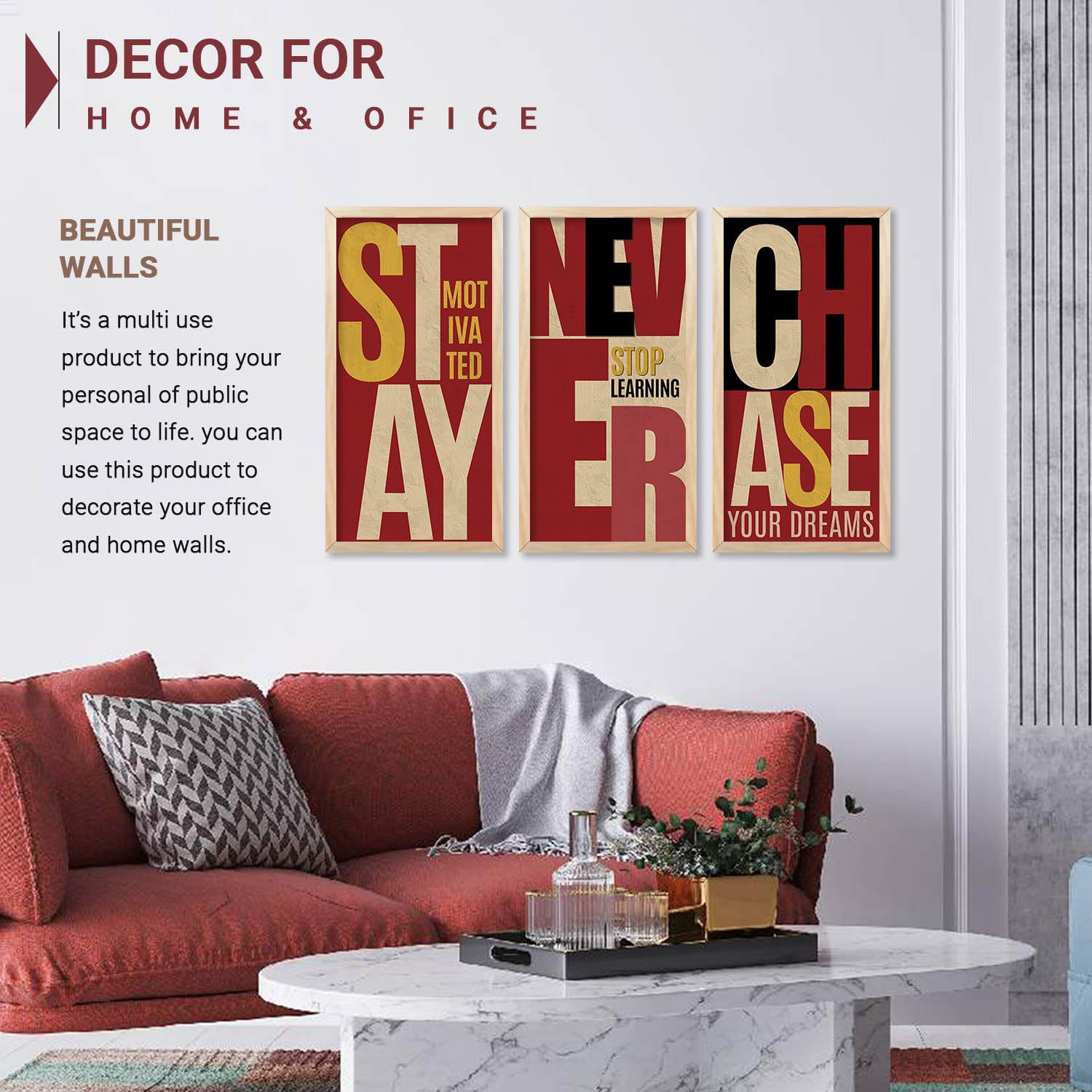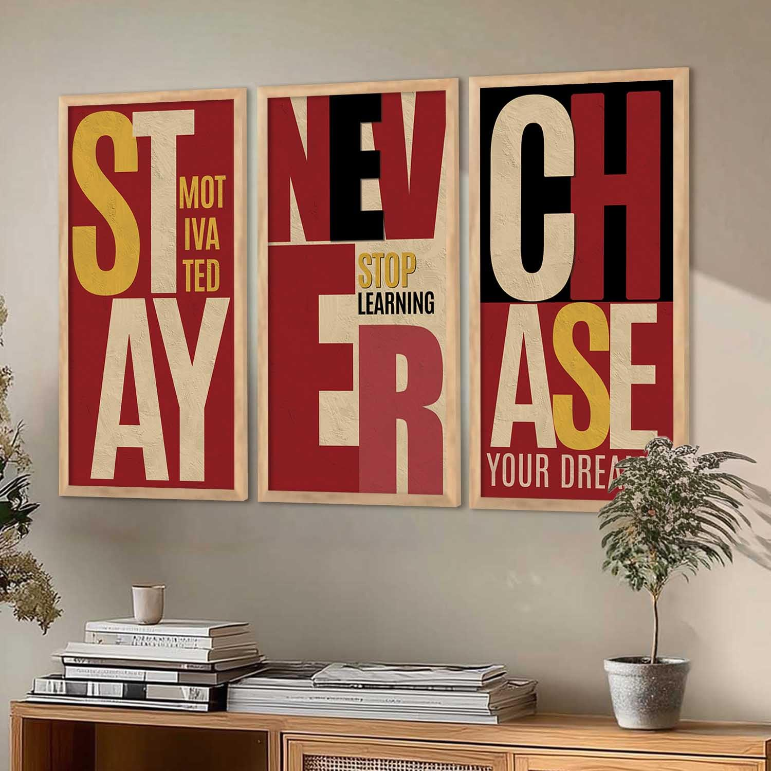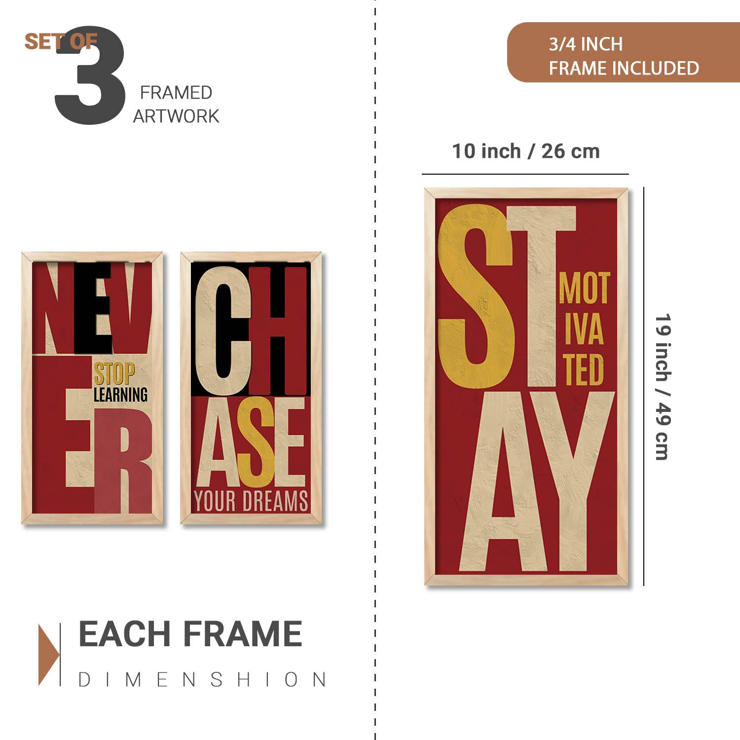 Elevate your walls with this set of 3 motivational quotes framed paintings (10 x 19 inch, Design B). Designed to inspire and uplift, these ready-to-hang wall art pieces are ideal for offices, living rooms, and bedrooms, bringing positivity, encouragement, and a stylish decorative touch to any space.