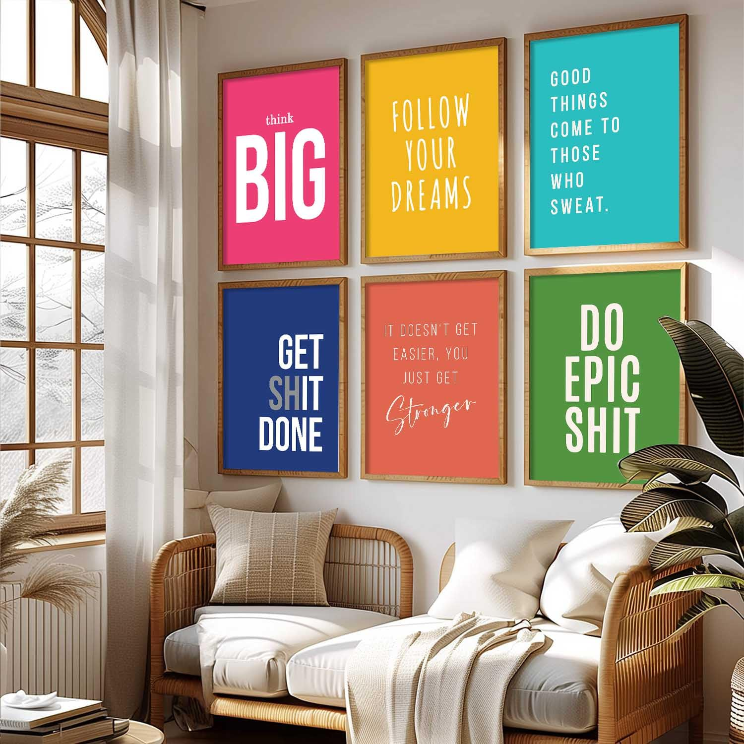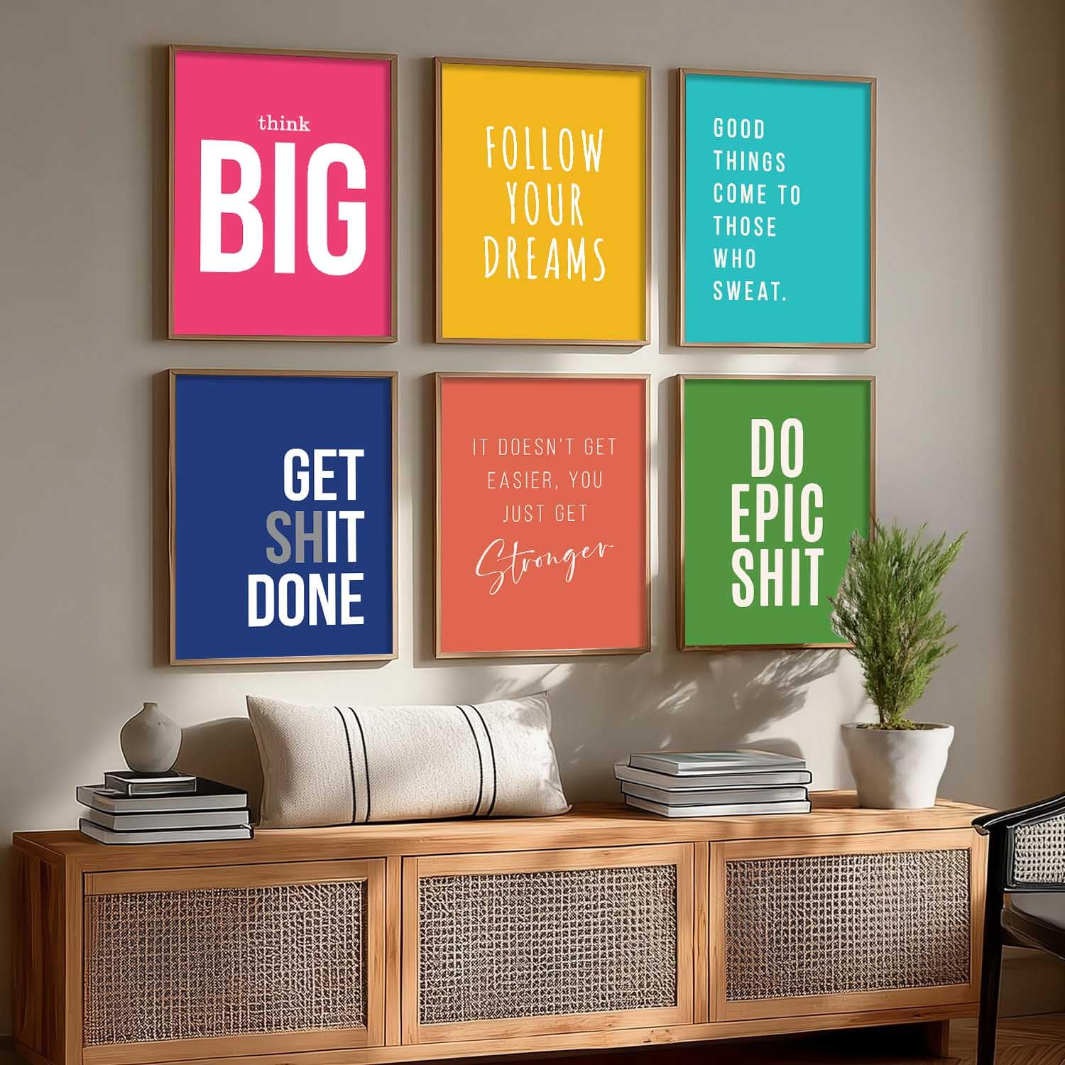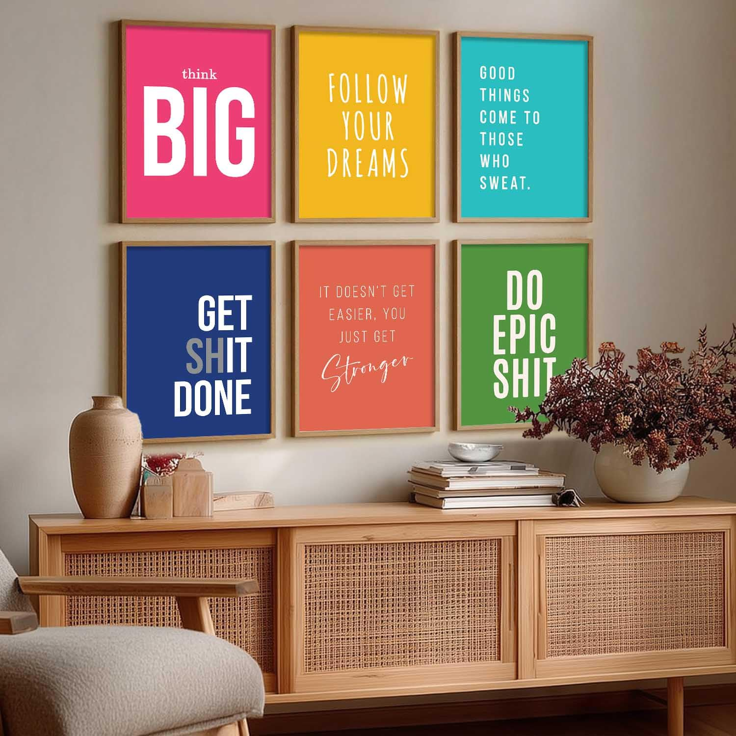 Inspire your space with this set of 6 motivational quotes frames (10×13 inches, Art 7). Ideal for decorating bedrooms, living rooms, or offices with a stylish and uplifting touch.