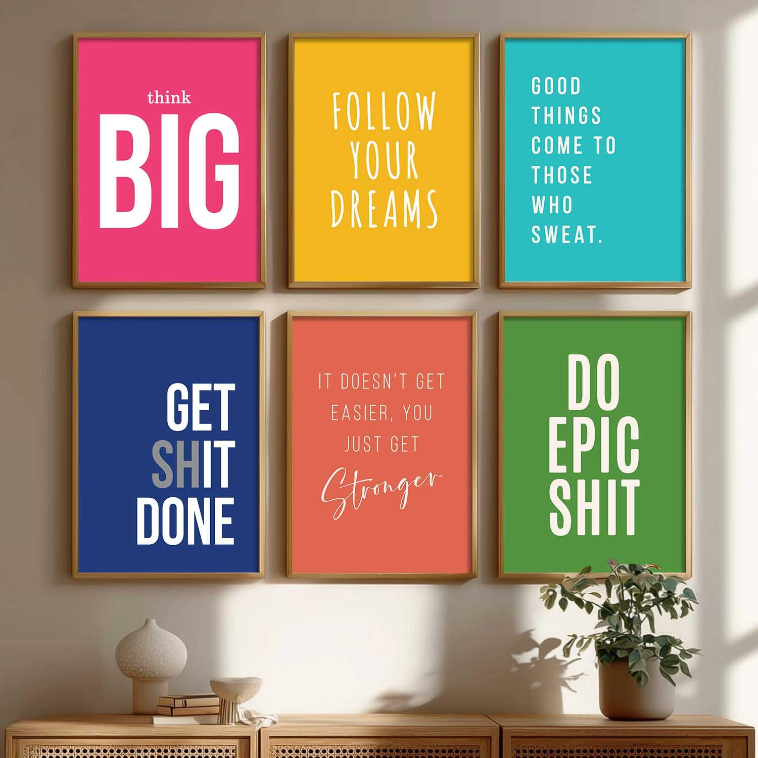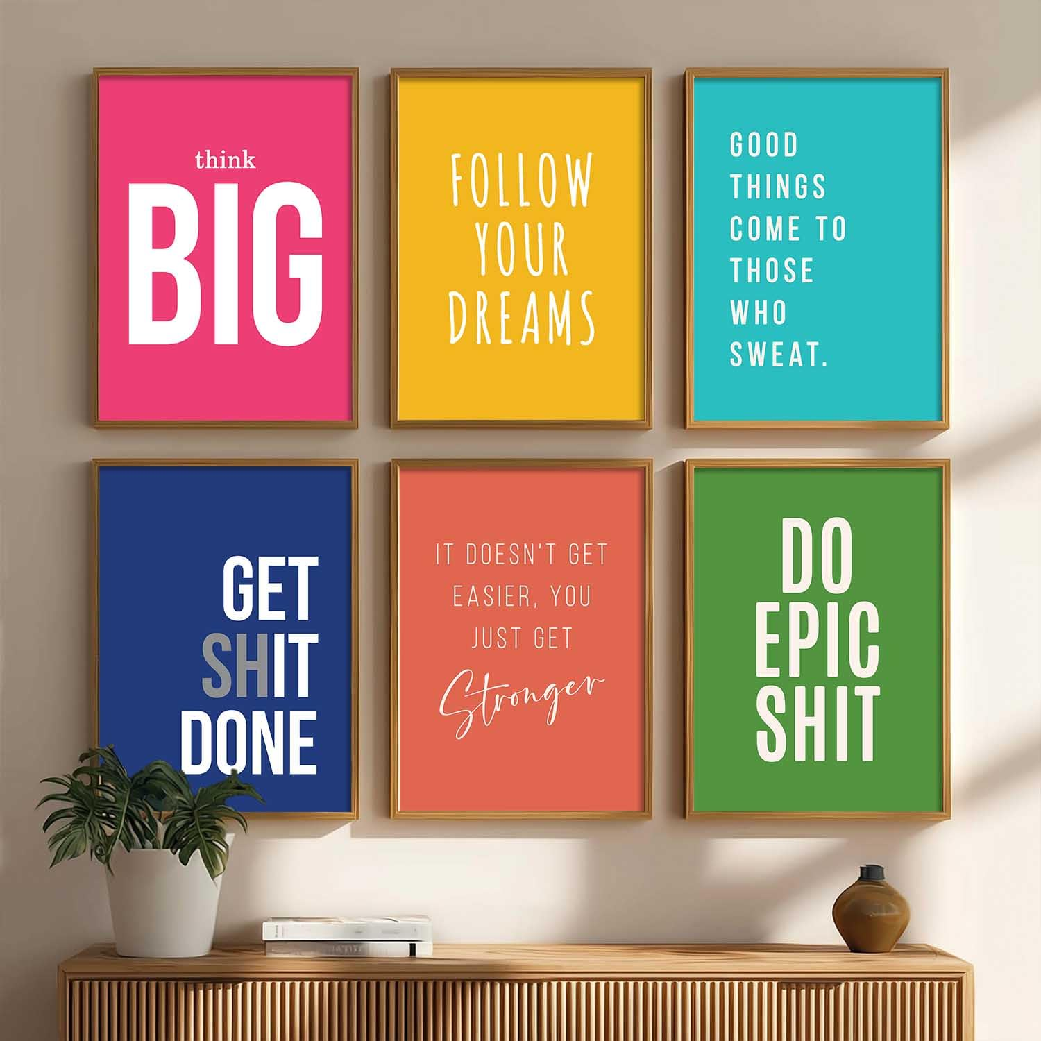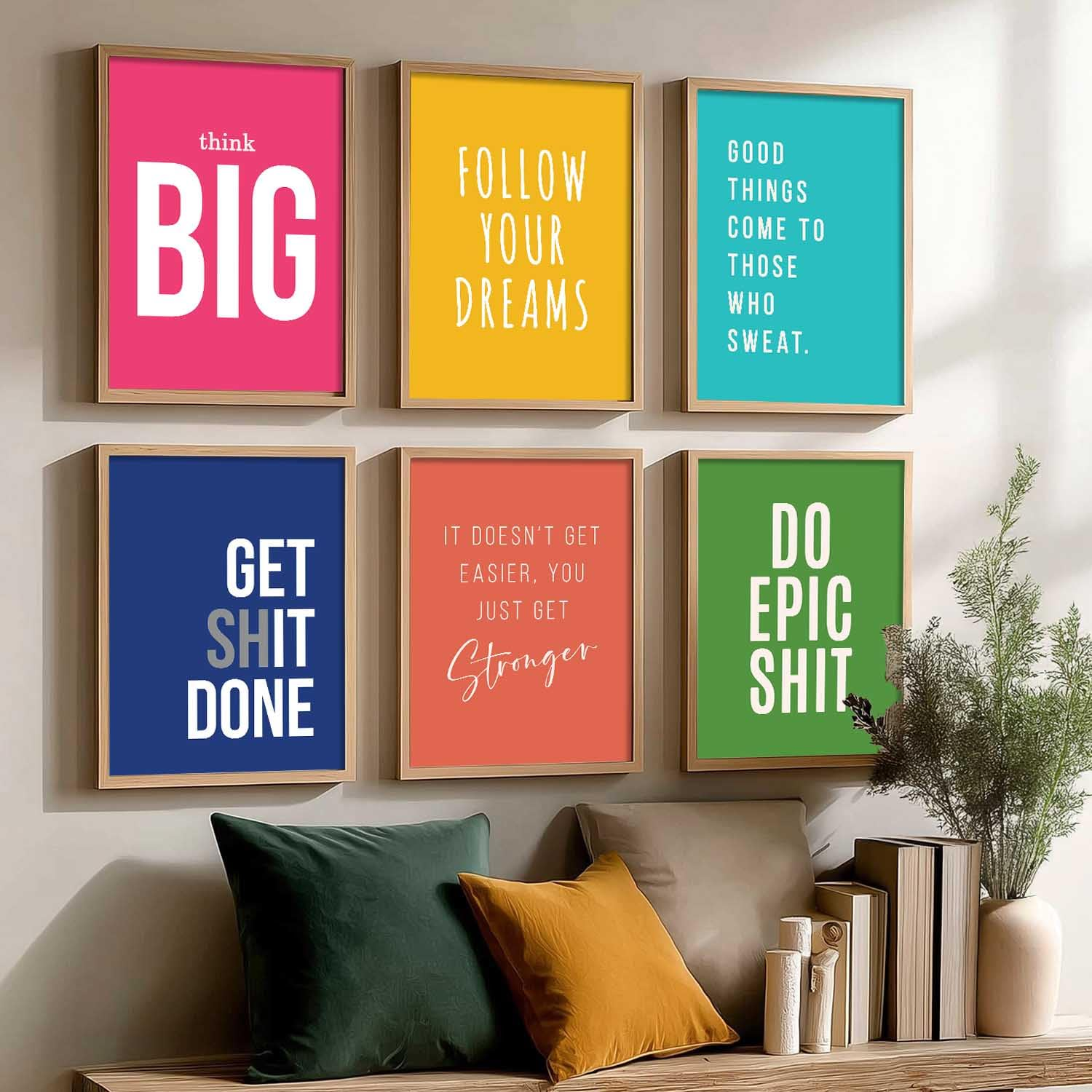 Inspire your space with this set of 6 motivational quotes frames (10×13 inches, Art 7). Ideal for decorating bedrooms, living rooms, or offices with a stylish and uplifting touch.