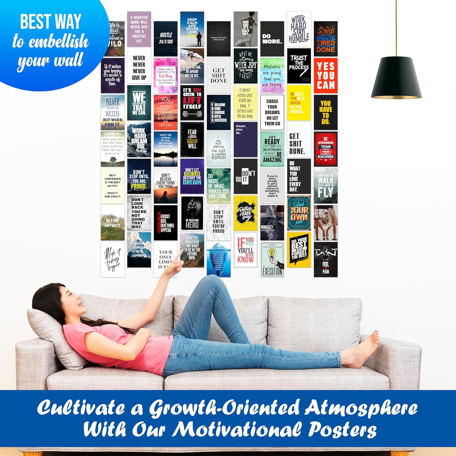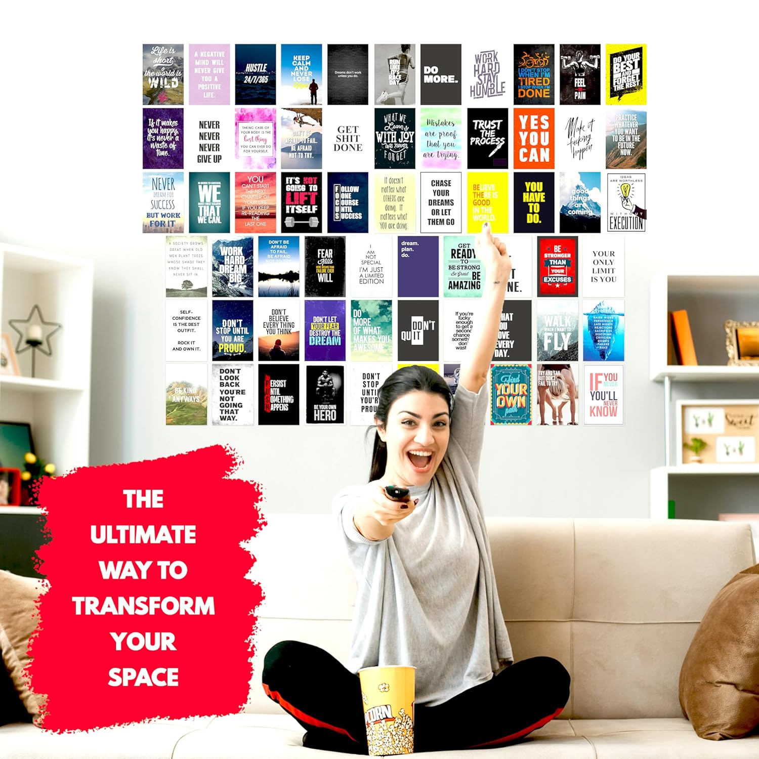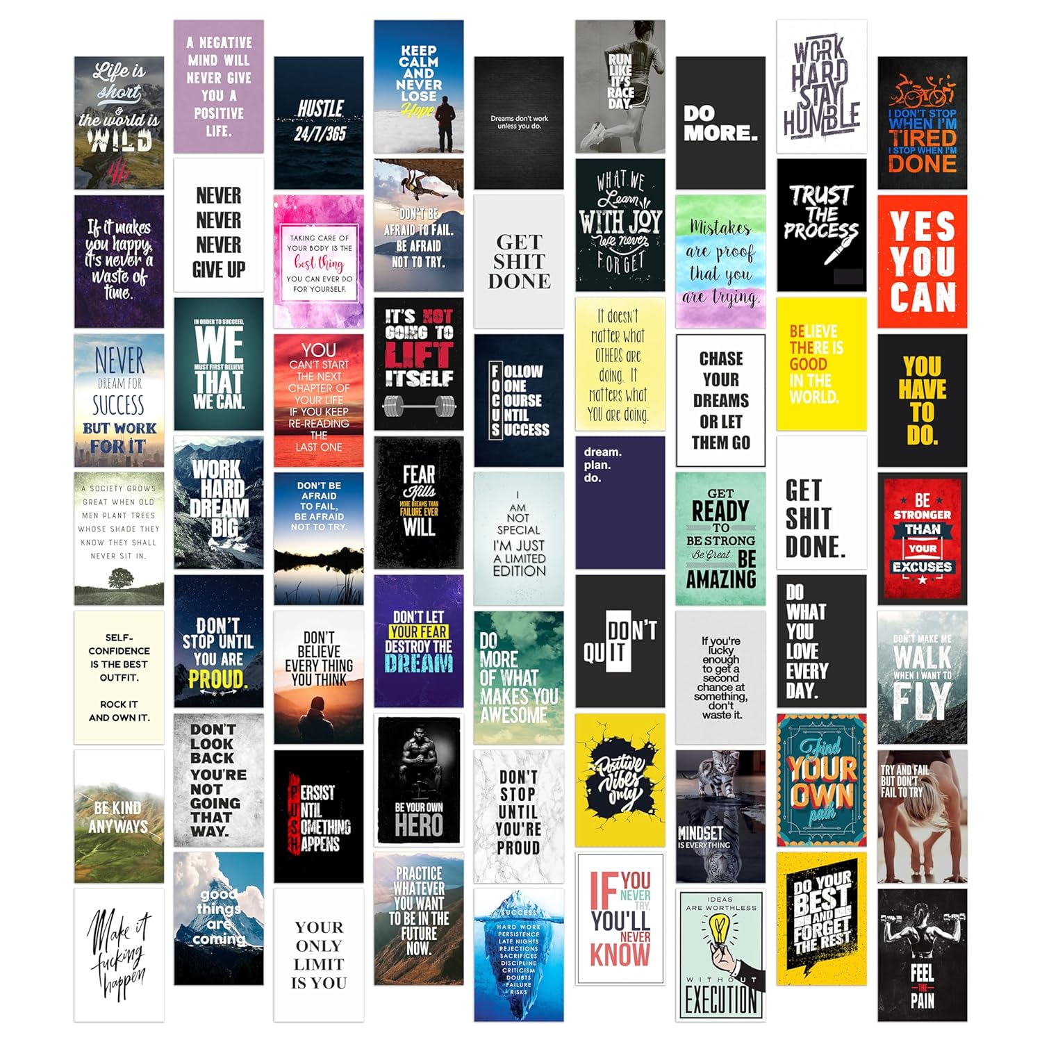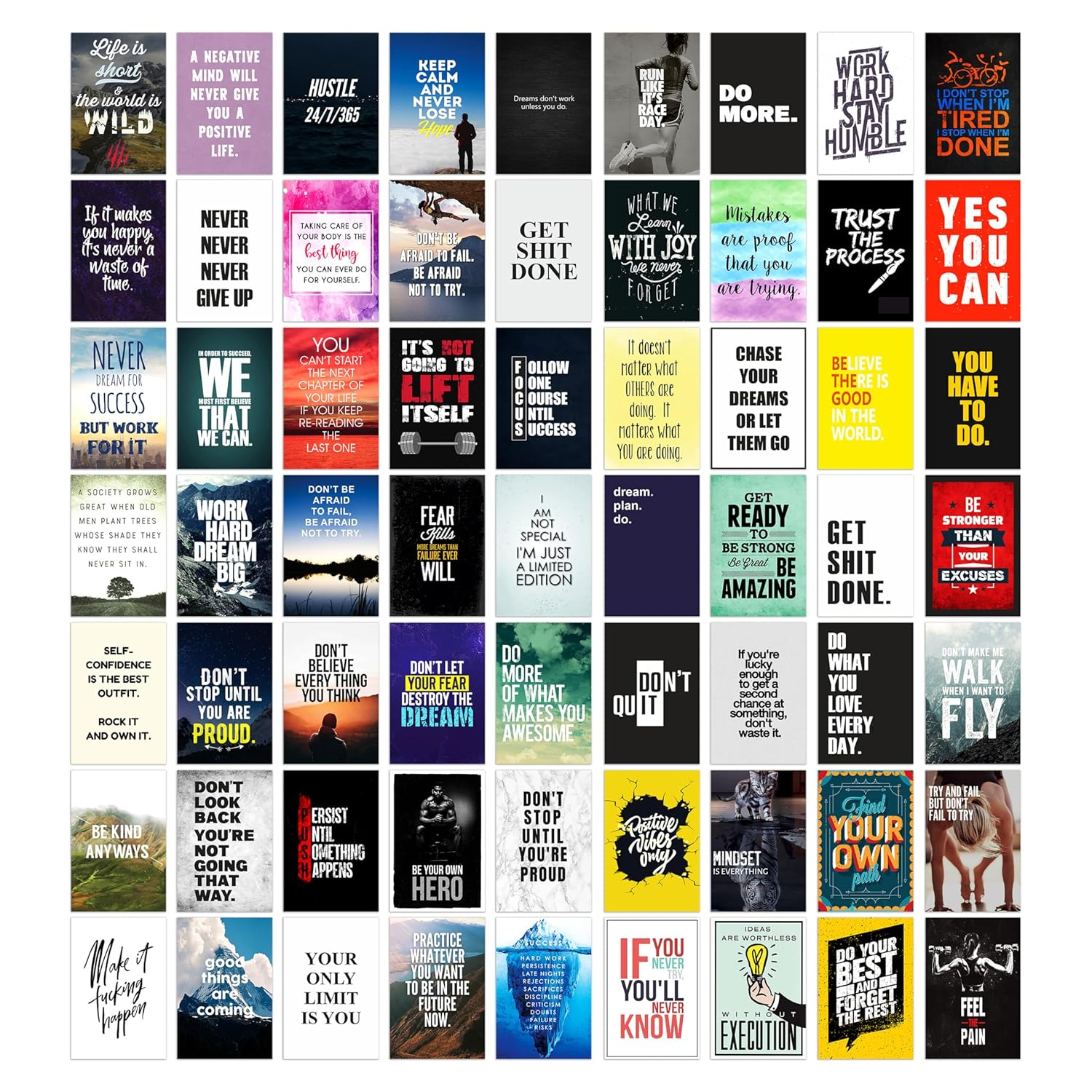 Pack of 63 inspirational wall art posters (4×6 inches) designed to create a stylish motivational collage. Ideal for decorating offices, bedrooms, and living rooms with uplifting quotes. Printed on high-quality paper for a vibrant and elegant finish.
