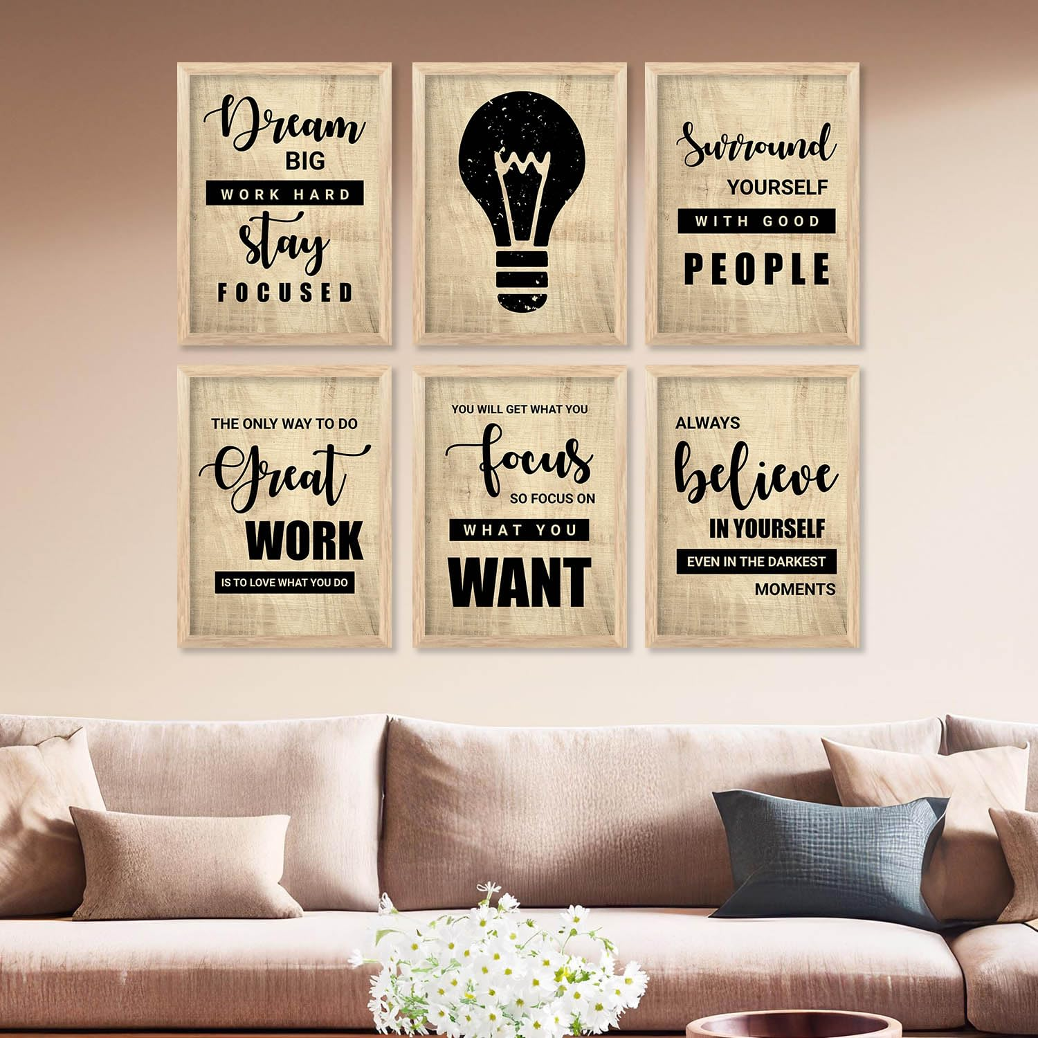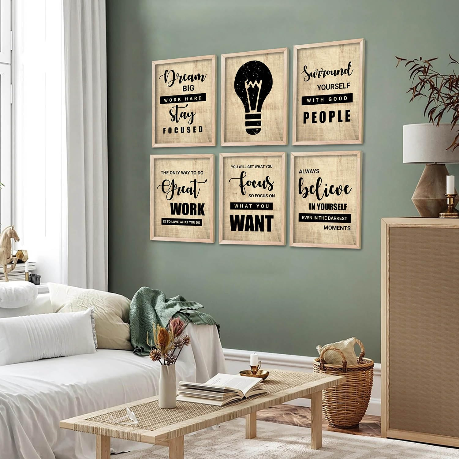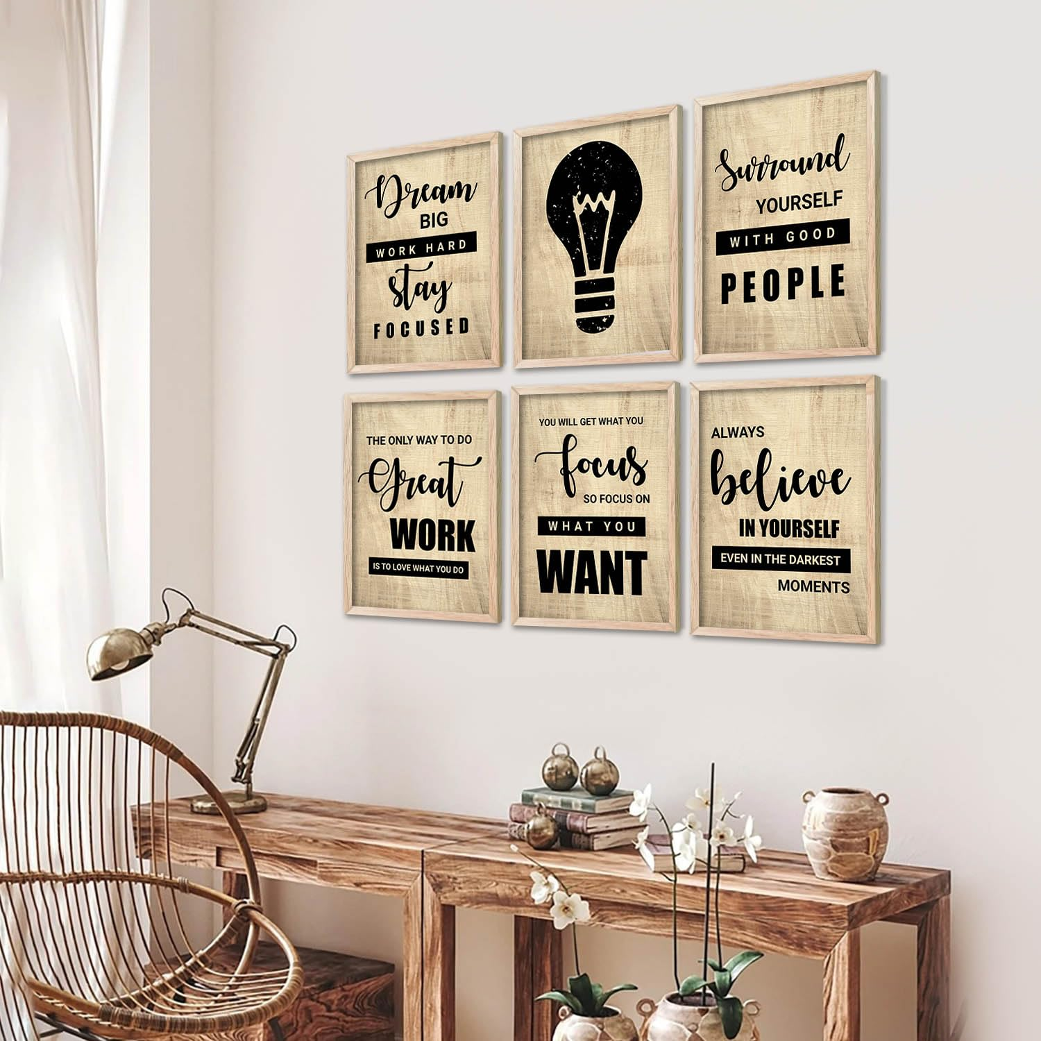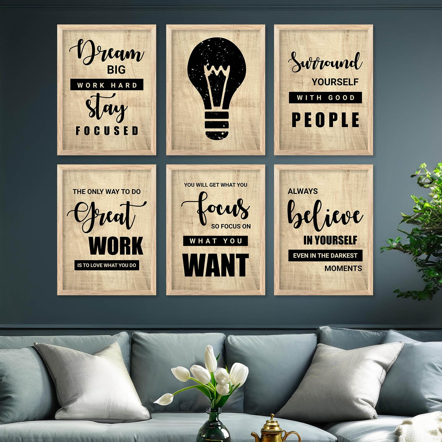 This is a set of 6 inspirational wall art prints designed to add motivation and style to any space. Each print features bold typography with uplifting quotes such as “Dream Big, Work Hard, Stay Focused” and “Always Believe in Yourself”, along with a modern light bulb graphic symbolizing ideas and creativity.