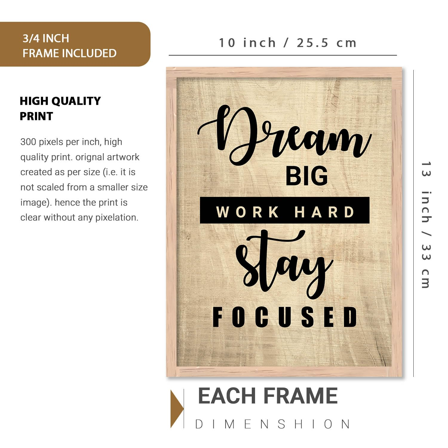 The prints come in a natural wood-style frame (3/4 inch thick) and measure 10 x 13 inches (25.5 x 33 cm) each. Created in high-resolution 300 DPI, the artwork offers sharp, clear, and high-quality printing without pixelation.