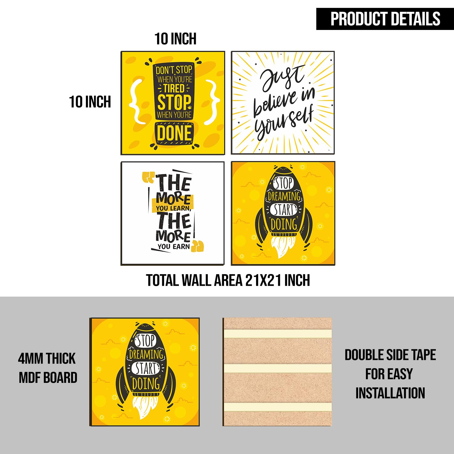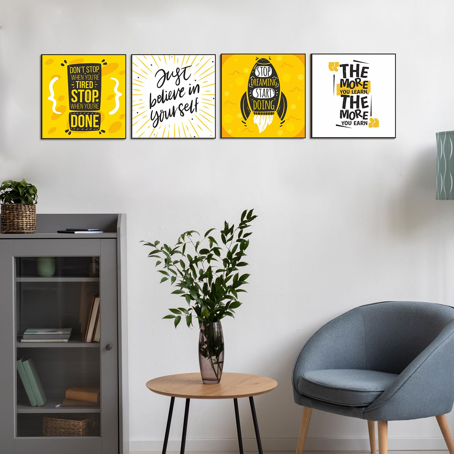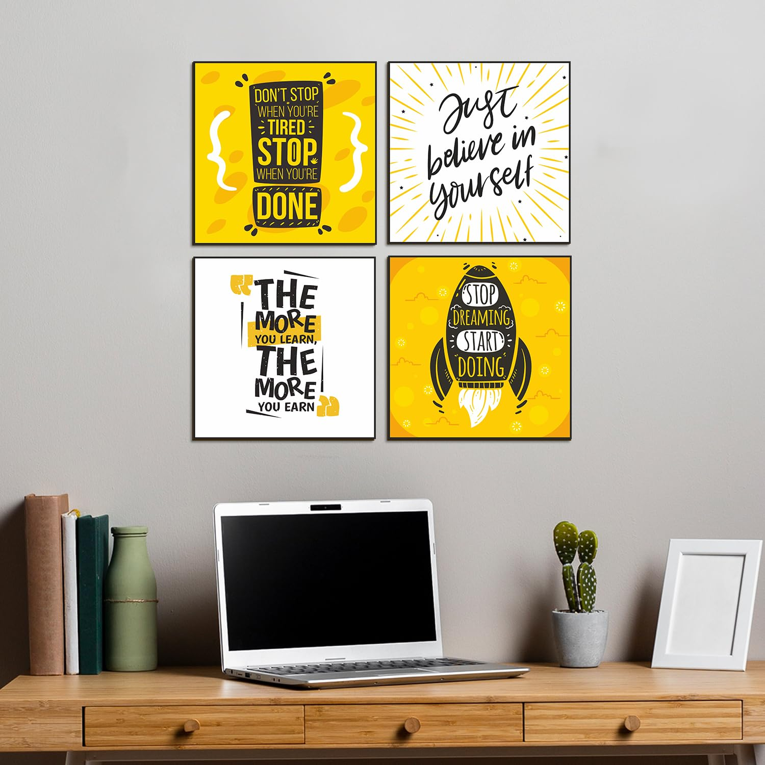 Motivational Framed Poster Set of 4 (10″ x 10″, Style E) featuring inspiring quotes and a contemporary design—ideal for brightening up your home, office, or study space.