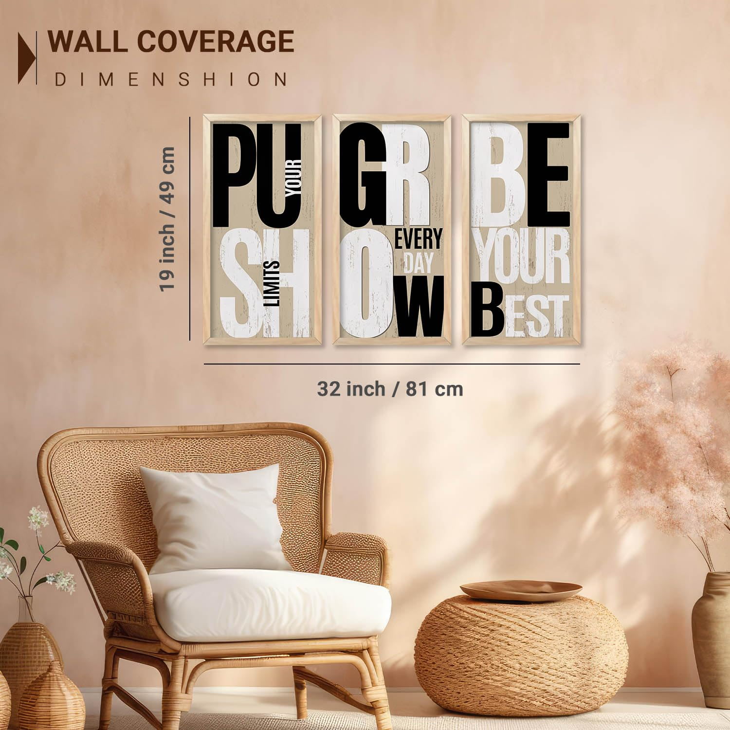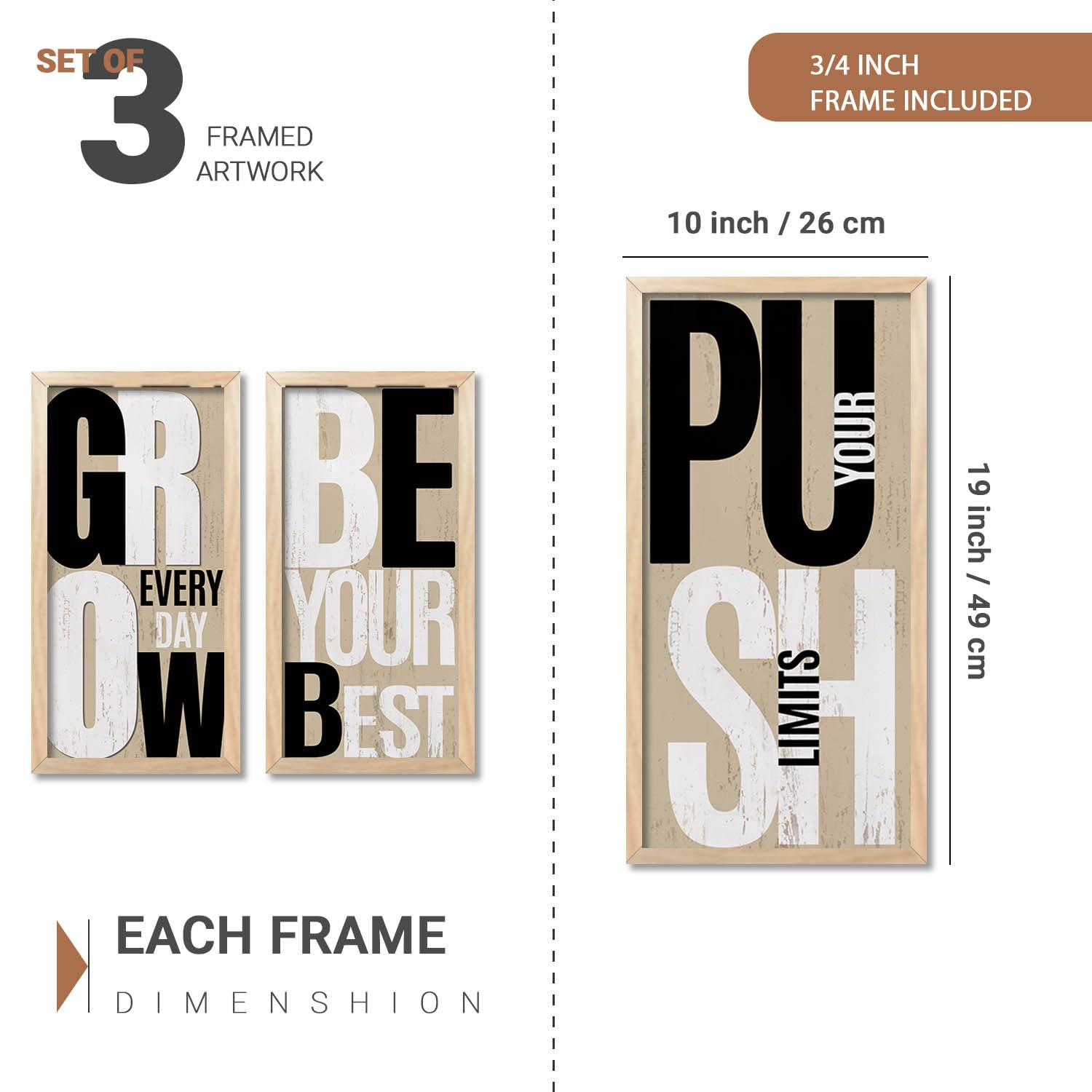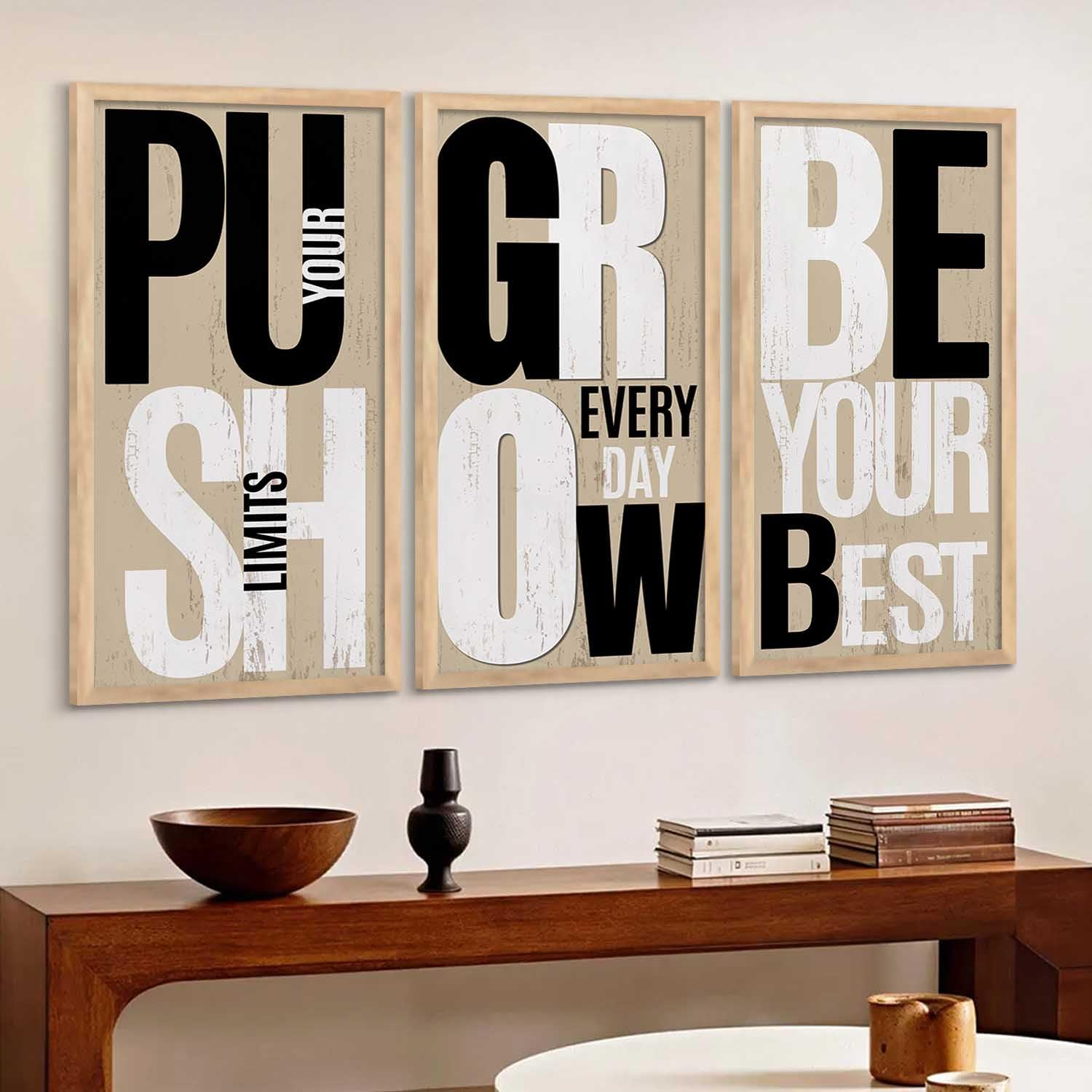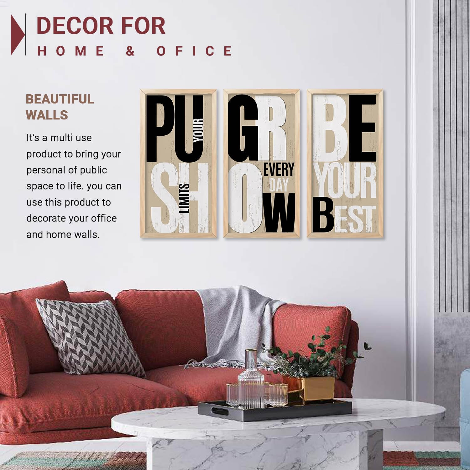 Upgrade your interiors with this Set of 3 Motivational Quote Wall Frames (10×19 inch, Design D). Featuring inspiring typography and premium-quality prints with sturdy frames, these ready-to-hang wall décor pieces are perfect for living rooms, bedrooms, offices, and study spaces. A great choice to add positivity and style to any wall.