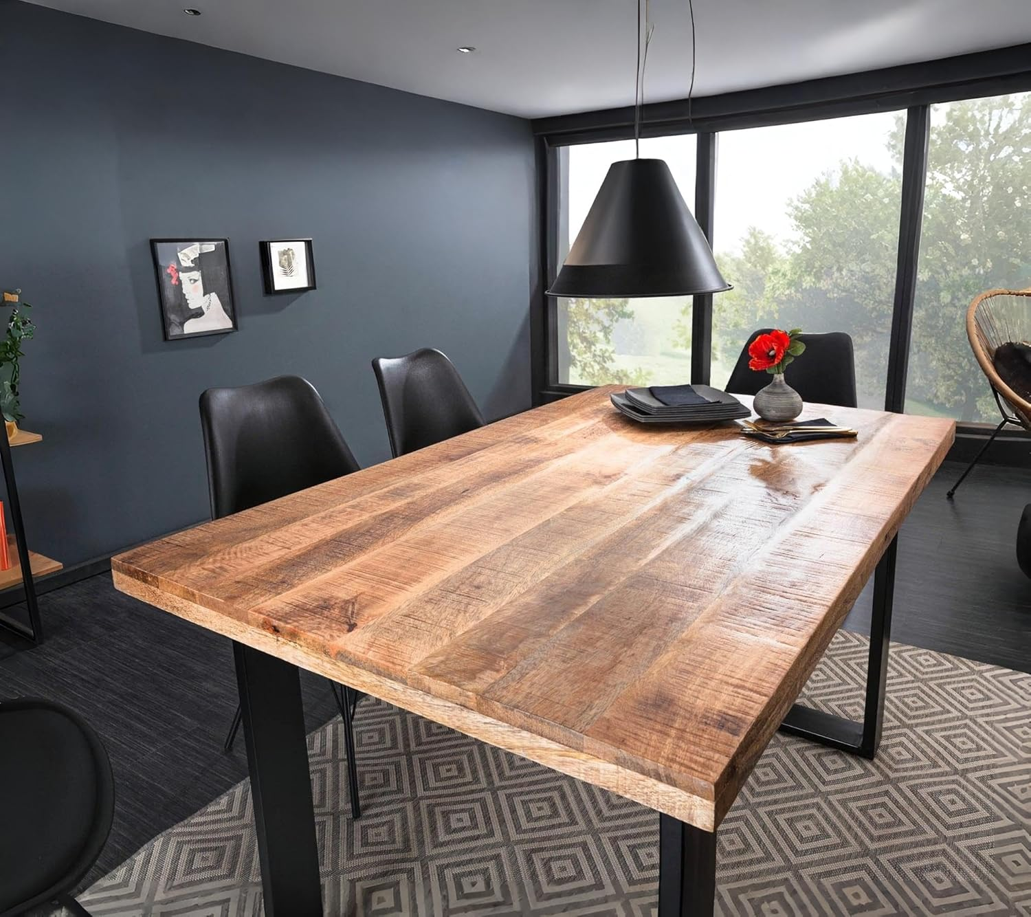 Crafted from solid mango wood, this rough-finish dining table features a sturdy metal leg frame for enhanced stability and industrial appeal. Measuring 160 x 90 x 75 cm, it offers ample space for family meals and gatherings, while the natural wood finish adds warmth and rustic charm to any dining area.