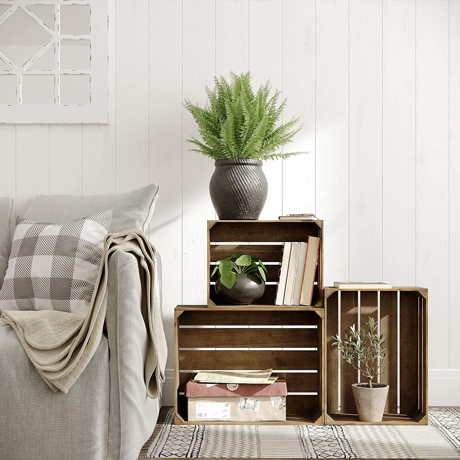 KRAYOG Rustic Solid Wood Display Crates – Set of 3 Nesting Wooden Storage Boxes with Handles, Farmhouse Style Milk Crate Organizer (Brown Finish)**