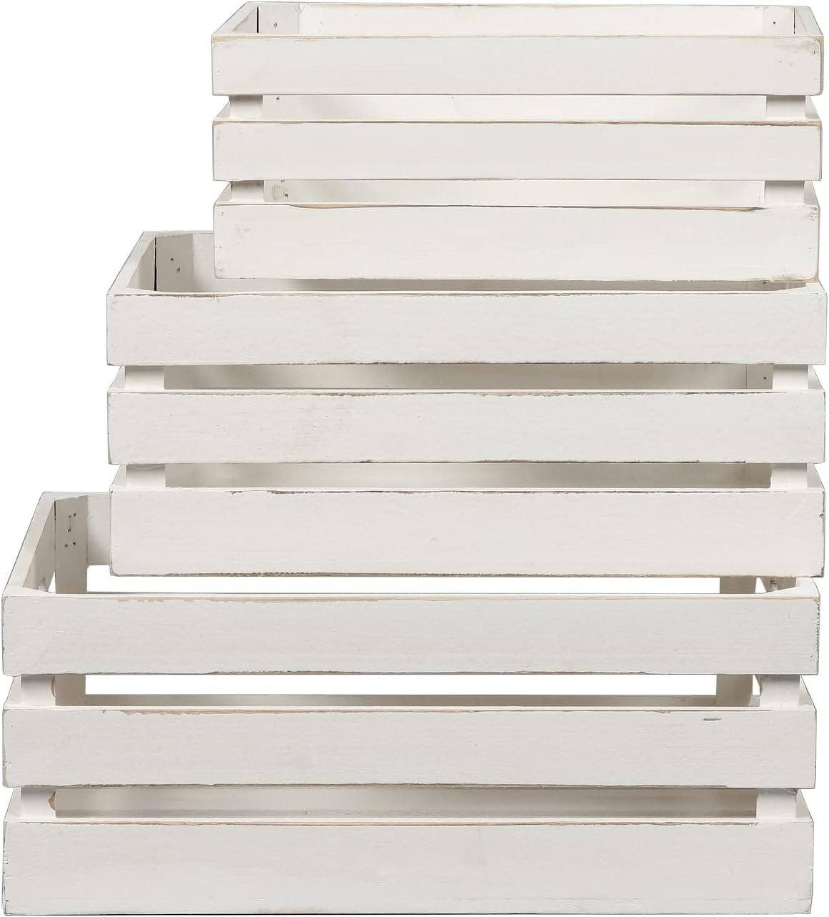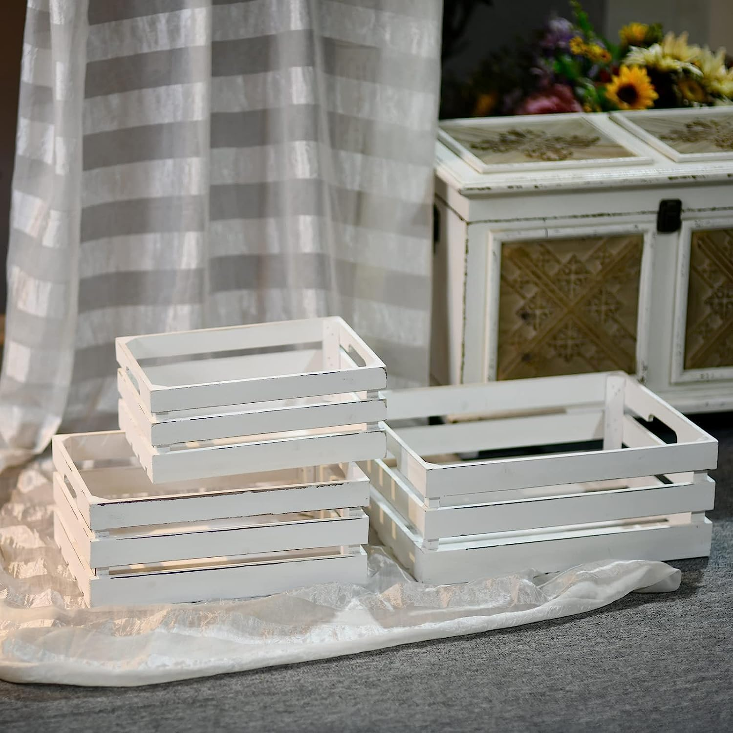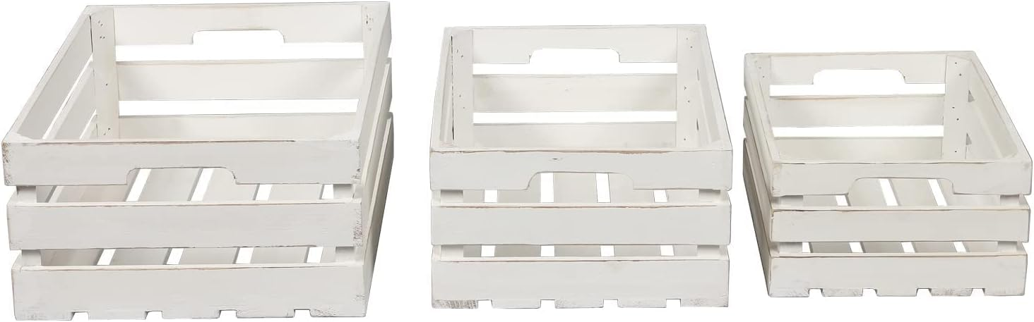 Bring timeless farmhouse charm to your space with this set of 3 rustic white solid wood nesting crates. Designed for both storage and display, these durable wooden boxes feature sturdy built-in handles for easy carrying and stacking. Ideal for organizing books, plants, pantry essentials, or retail merchandise while adding a clean, vintage-inspired touch to any room.