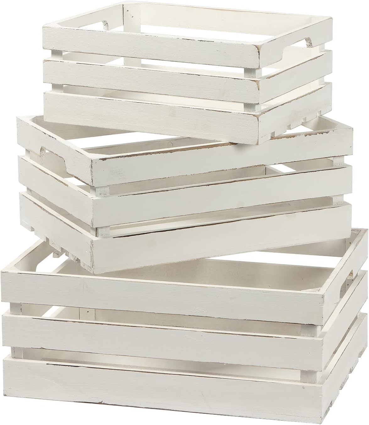 KRAYOG Rustic White Solid Wood Display Crates – Set of 3 Nesting Farmhouse Storage Boxes with Built-In Handles