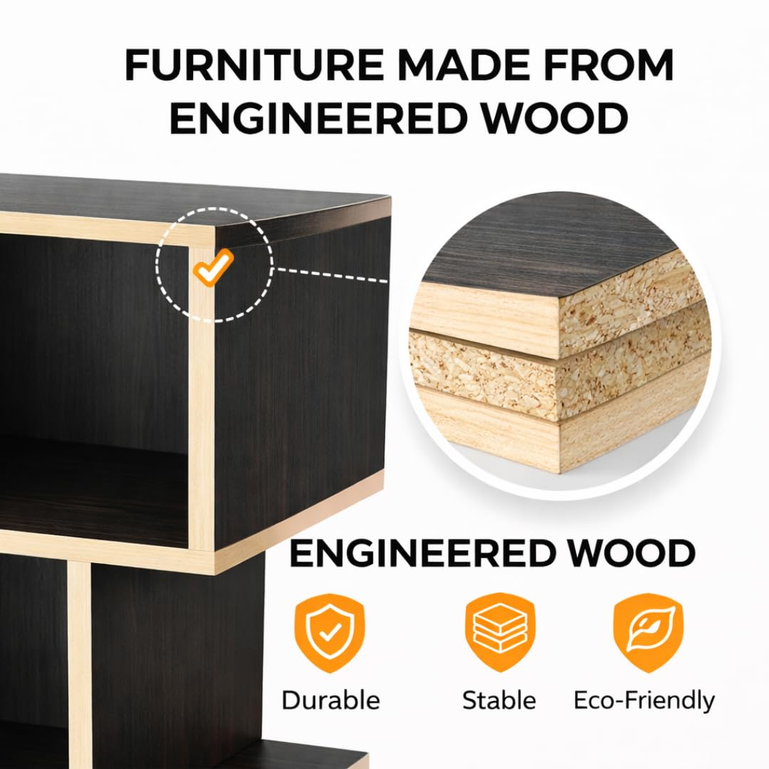 S-shaped brown 6-tier wooden bookshelf crafted from engineered plywood. A modern, freestanding corner display cabinet designed to organize books and décor in living rooms, bedrooms, or offices.