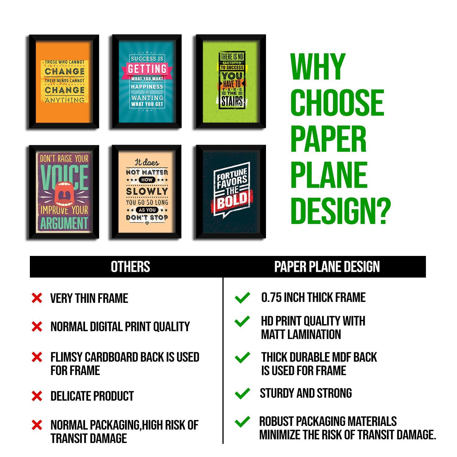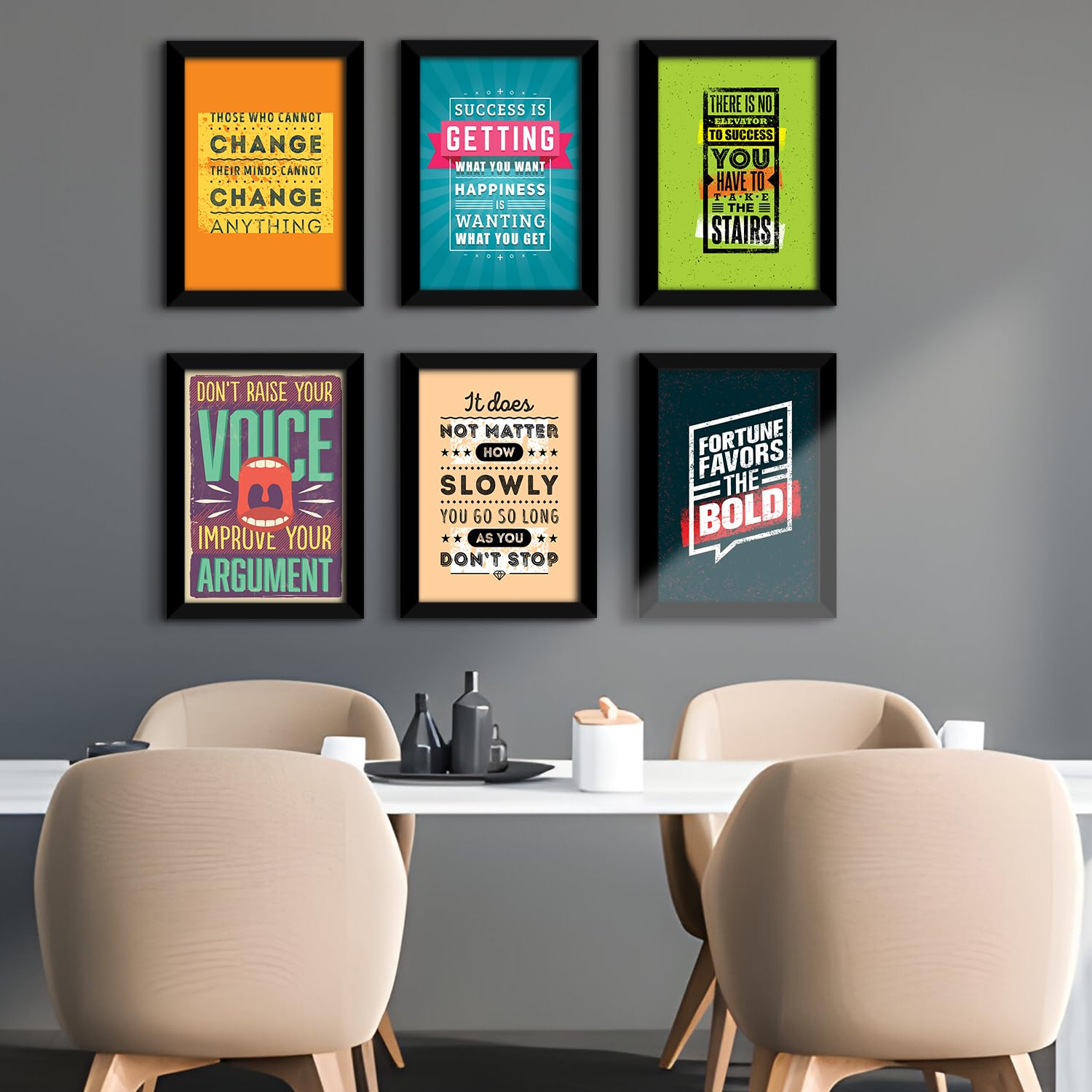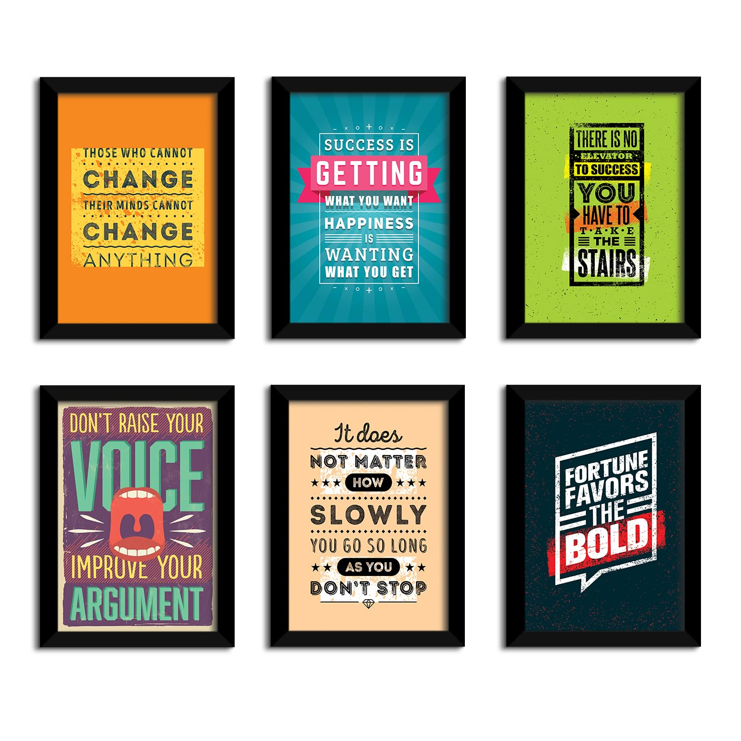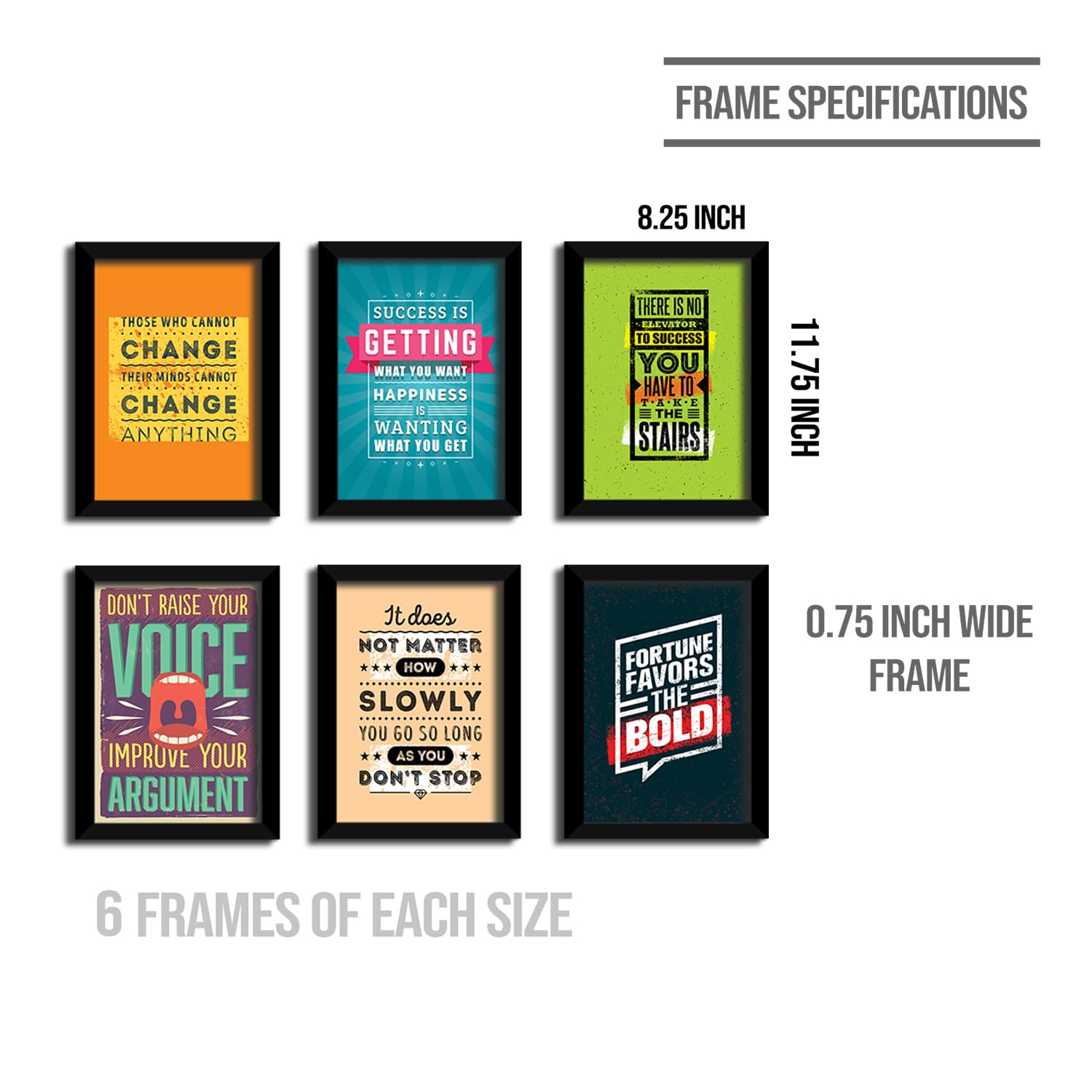 Set of 6 motivational framed wall posters featuring inspiring, multicolor quotes to uplift any space. Built with 0.75-inch thick frames, HD print quality, matte lamination, and durable MDF backing for a sturdy and long-lasting finish. Ideal for home, office, or bedroom décor, and safely packaged for secure delivery.
