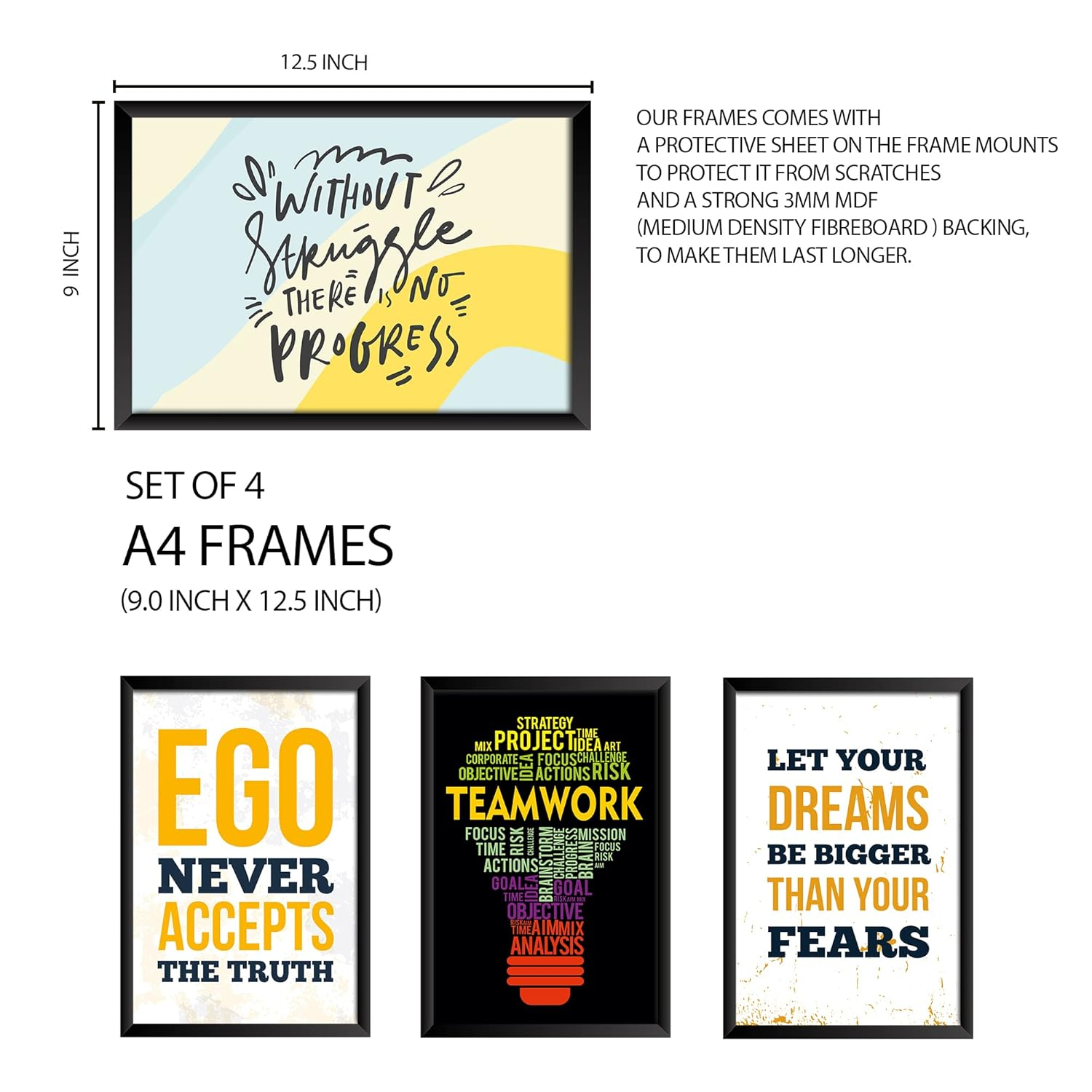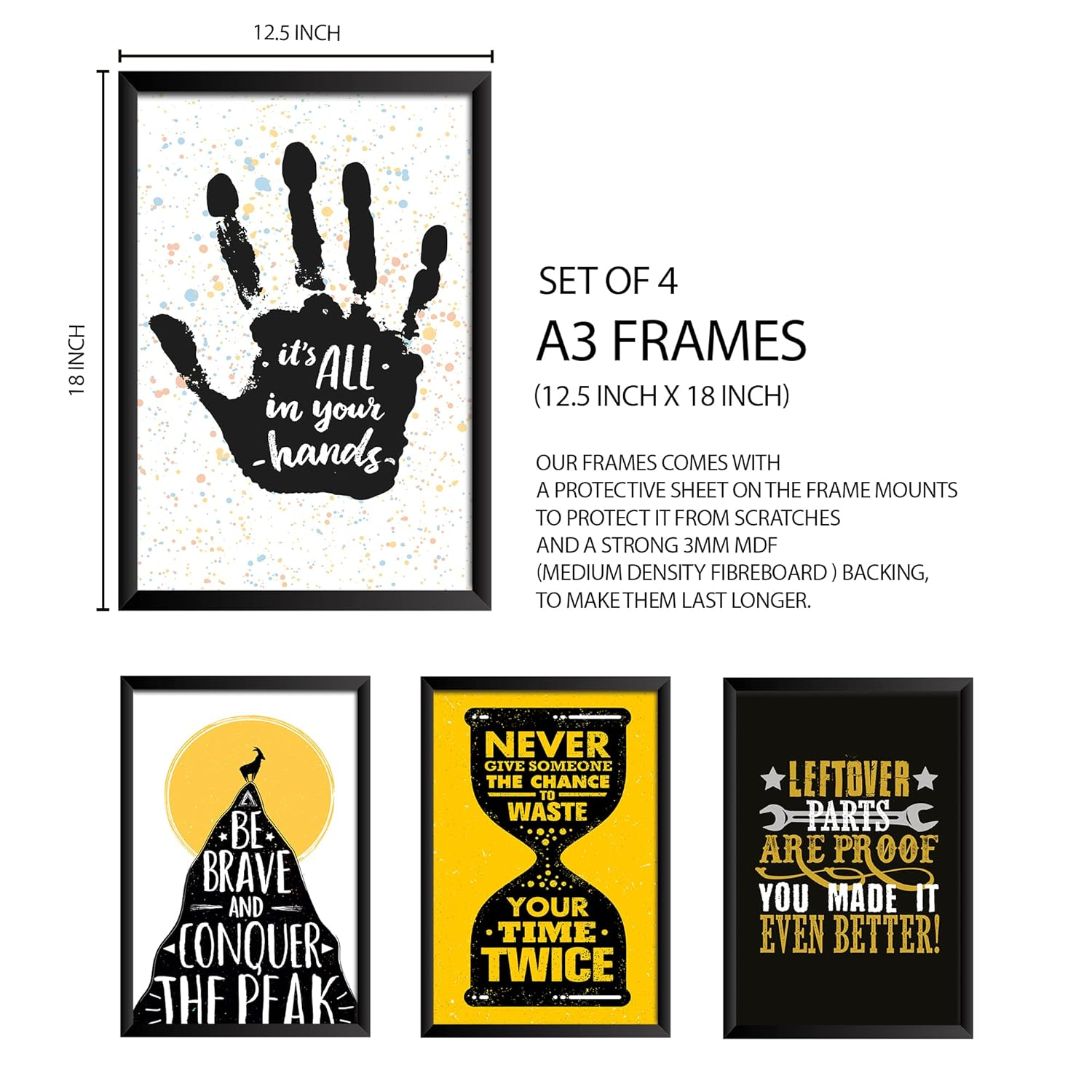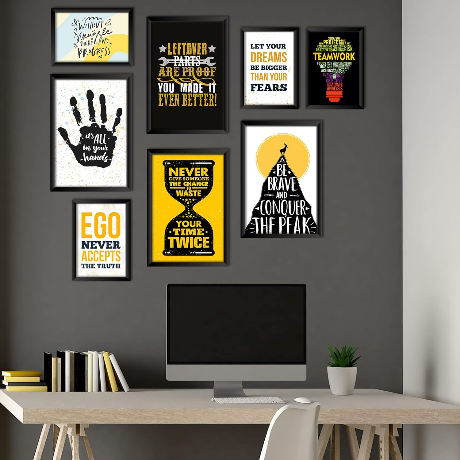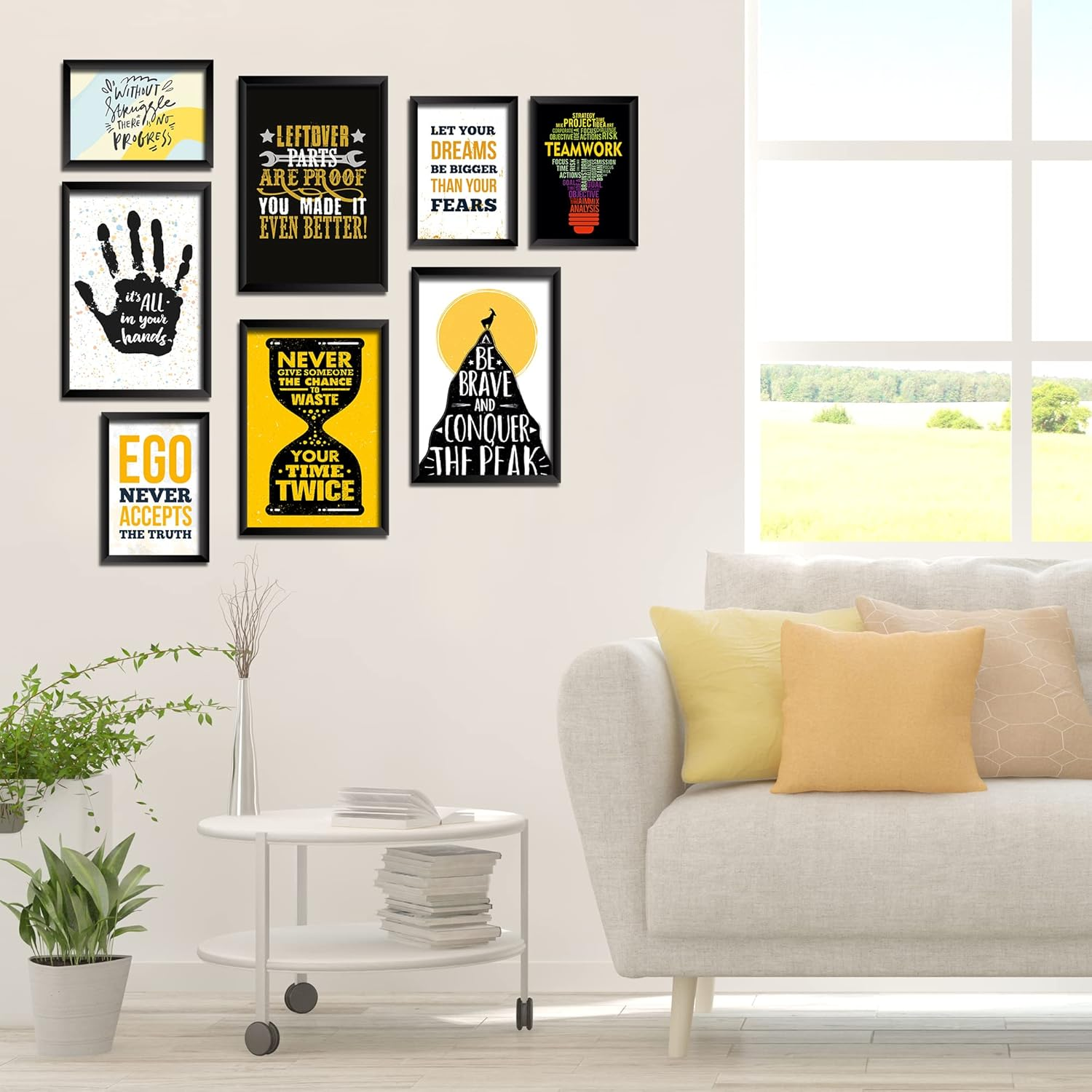 Boost your home or office décor with this set of 8 inspirational and motivational framed wall art posters. Designed with bold quotes and vibrant typography, these frames are available in 9 x 12.5 inch and 12.5 x 18 inch sizes. Each frame features a protective front sheet and sturdy 3mm MDF backing for durability, making them perfect for living rooms, bedrooms, offices, and workspaces.
