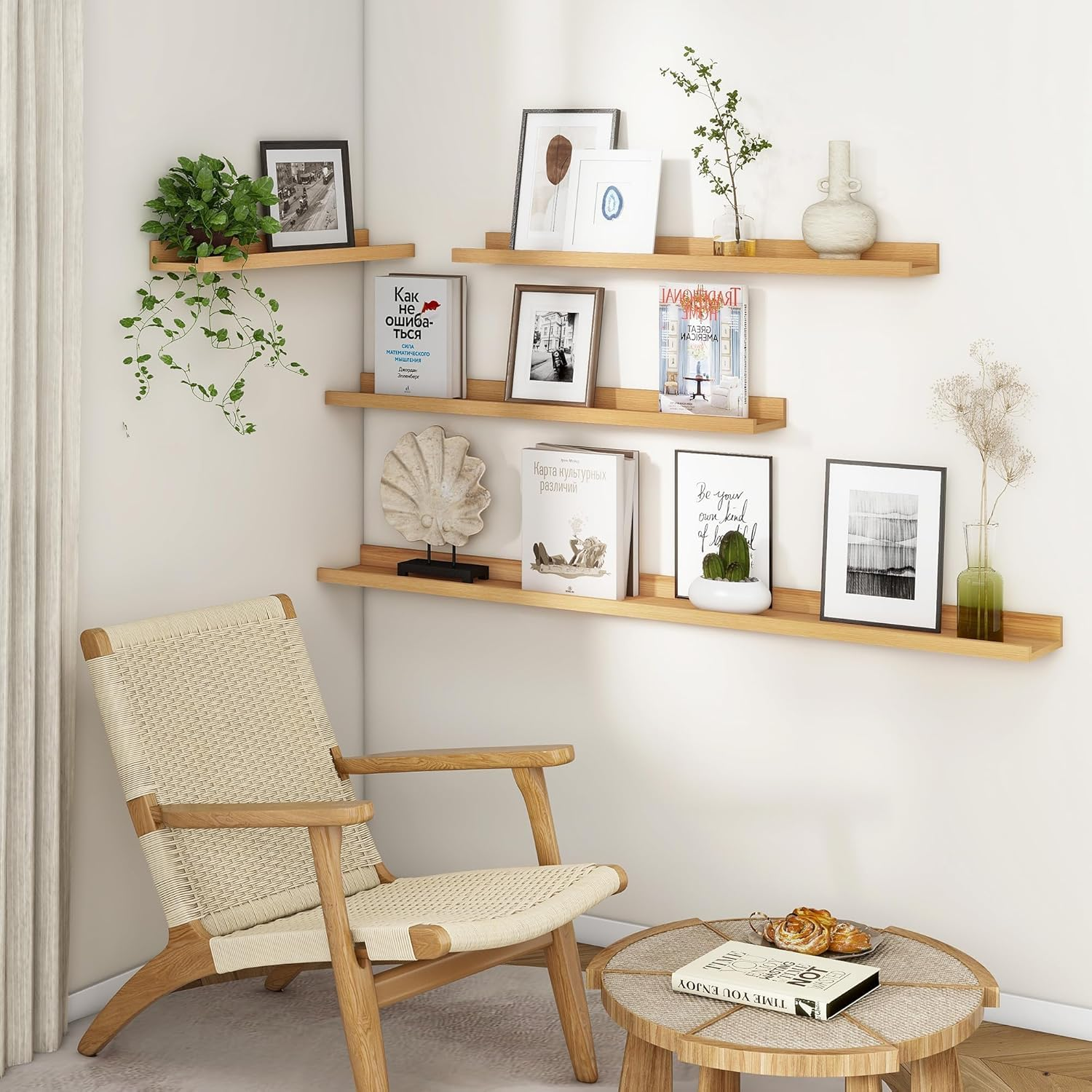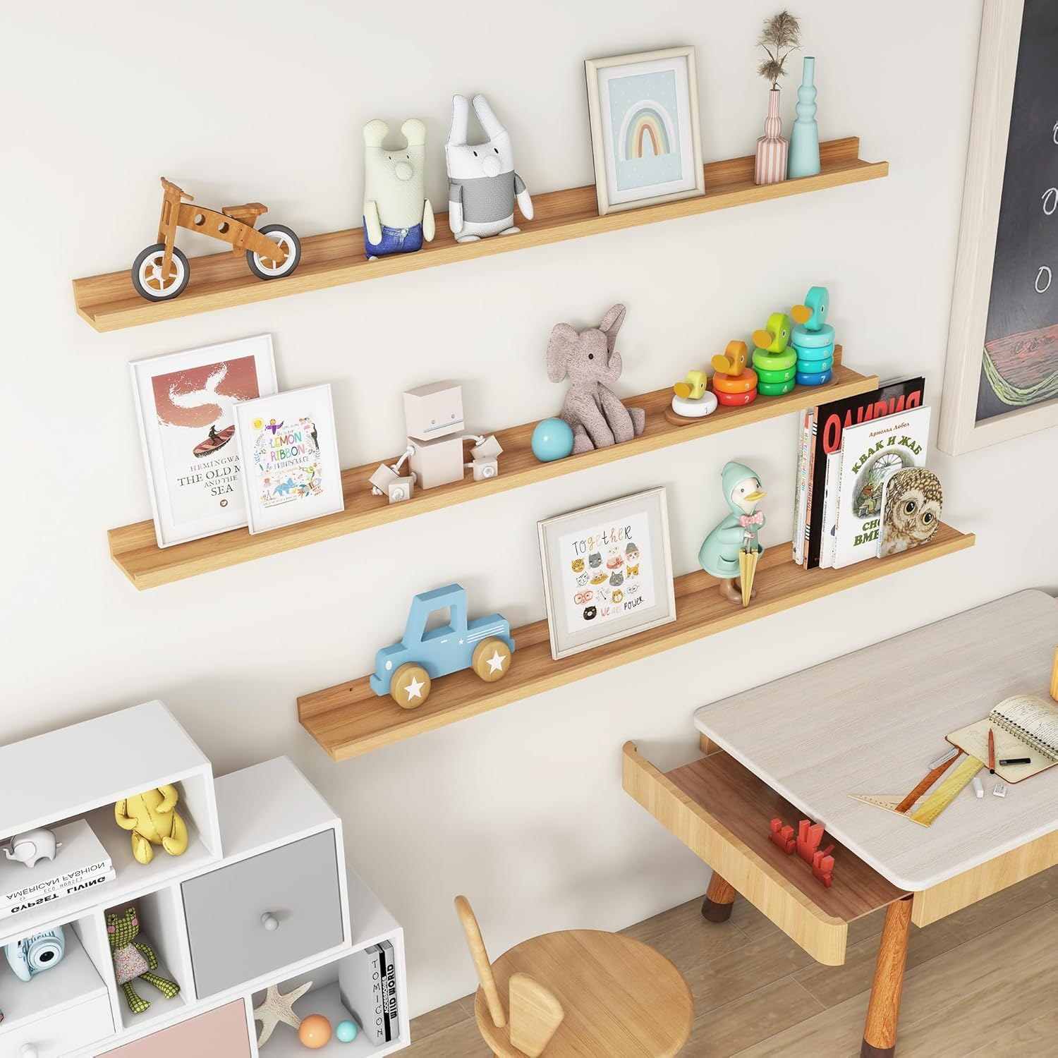Upgrade your wall décor with this set of 3 Sheesham wood floating shelves in a natural finish. Designed as sturdy picture ledge shelves, they are perfect for displaying photo frames, plants, books, and decorative accents in the bathroom, kitchen, bedroom, living room, or office. The 56-inch design adds both style and practical storage to any space.