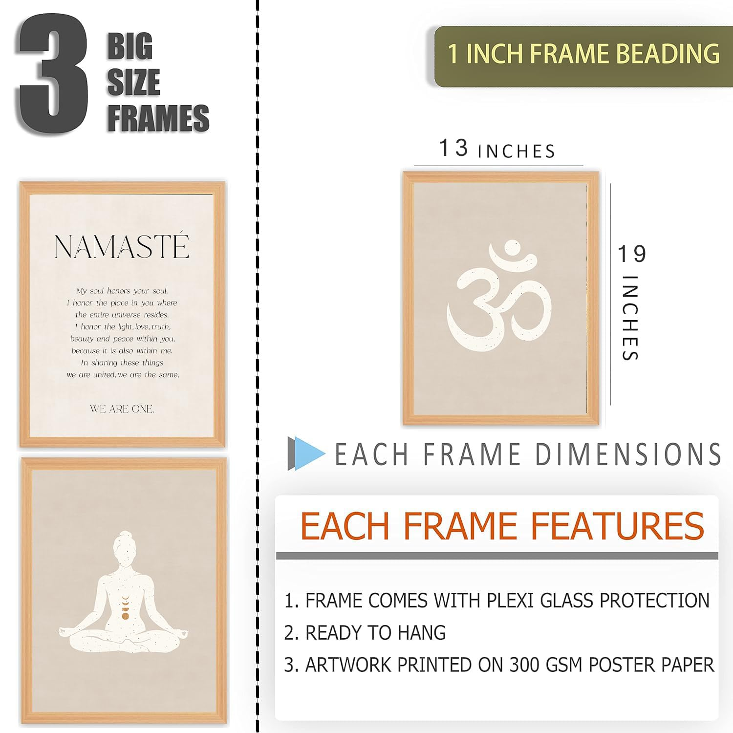 - Each frame is 13×19 Inches in size with acrylic sheet protection on printed arts. Beige color frame is used for rich and classy vibrant look on walls.