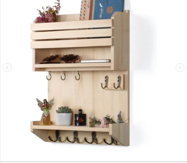 Versatile wooden wall organizer with mail holder, shelves, and key hooks. Natural wood finish provides functional storage for mail, keys, and décor. Perfect all-in-one entryway organization solution.