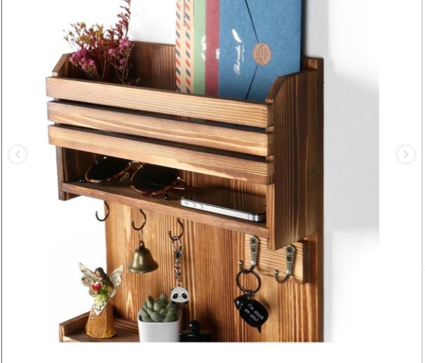- Multi-functional wooden wall organizer featuring mail slot, display shelves, and multiple key hook rows