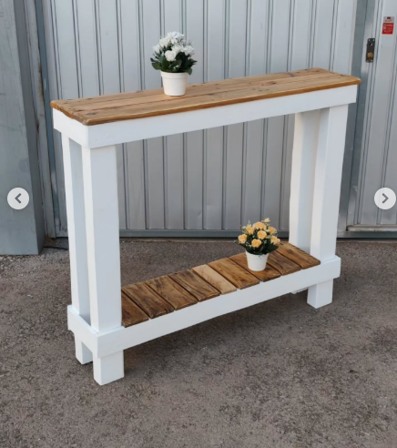 Farmhouse-style console table with natural wood top and white base. Features two-tier design with slatted bottom shelf. Perfect for entryways, hallways, or living rooms in coastal cottage décor.