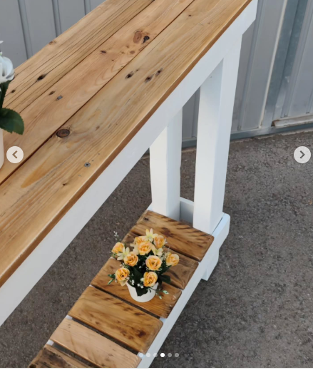 - Charming farmhouse console table featuring natural wood plank top with crisp white painted base