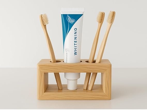 Natural Wooden toothbrush and toothpaste holder with minimalist design. Holds two toothbrushes and one toothpaste tube. Eco-friendly, water-resistant, and perfect for organizing bathroom countertops.
