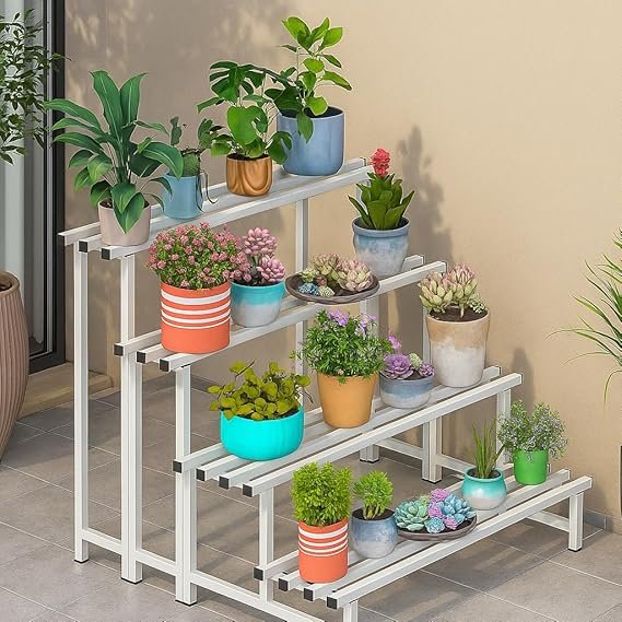 4-Tier Metal Flower Vase Stand | Heavy Duty Iron Plant Holder for Balcony, Garden, Home Décor | Indoor & Outdoor Multi-Purpose Pot Rack | Space-Saving & Durable (White)